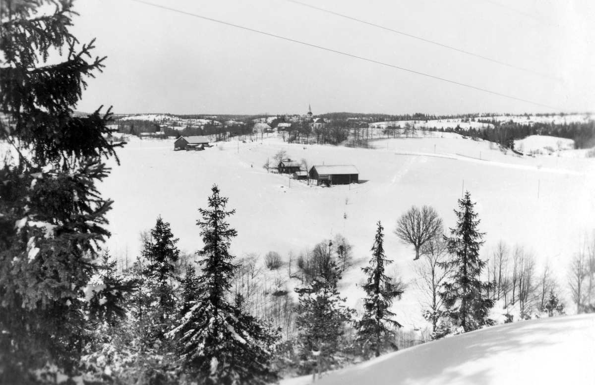 Gesäters by i vinterskrud, gården Holkan i förgrunden