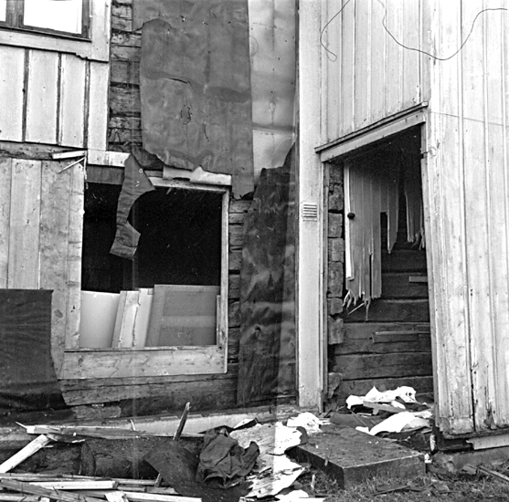 Bostadsfastigheten vid gatan, norra fasaden när brädfodringen börjat avlägsnas.