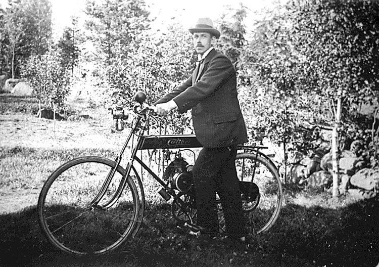 Oskar Karlsson med sin "Colibri", på vilken han åkte ända neråt Kinnekulle och Vinninga som skogsplantör.