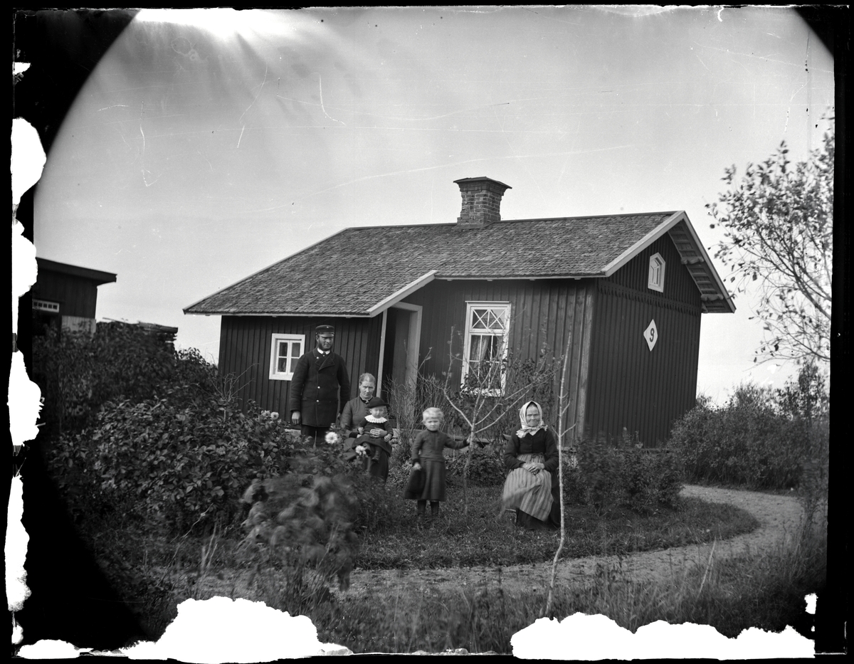 Familj framför banvaktsstuga nr 9 i Håkantorp