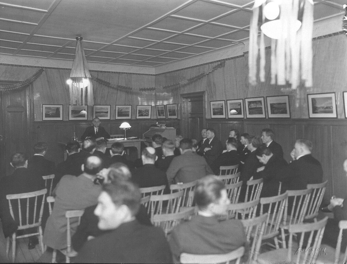 Sammanträde, antagligen kommunfullmäktige. Enar Berglund är ordförande. Efter väggen kan E.A. Edlund skönjas. Salen användes även av skolan.