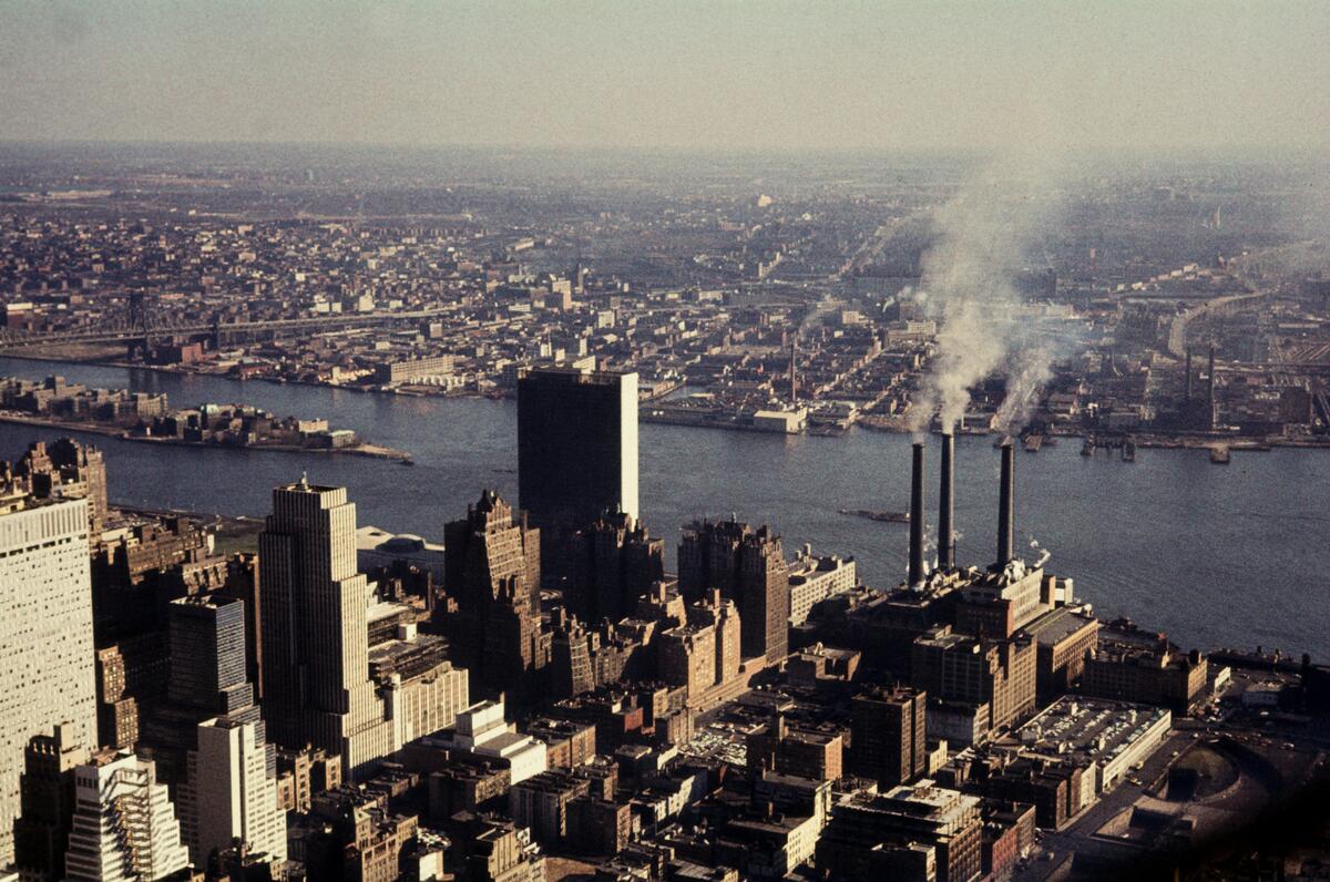 Vy över Manhattan och Brooklyn med FN-skrapan vid vattnet.