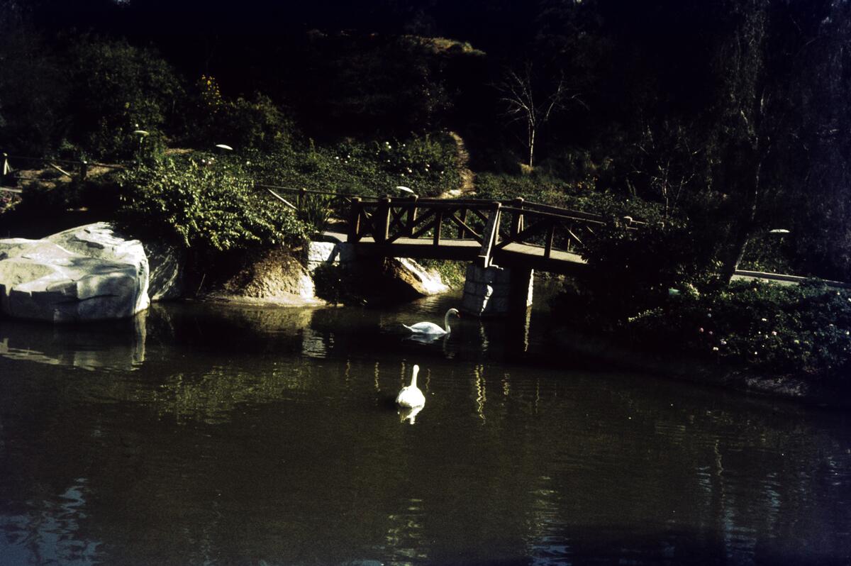 En damm med svanar på Disneyland.