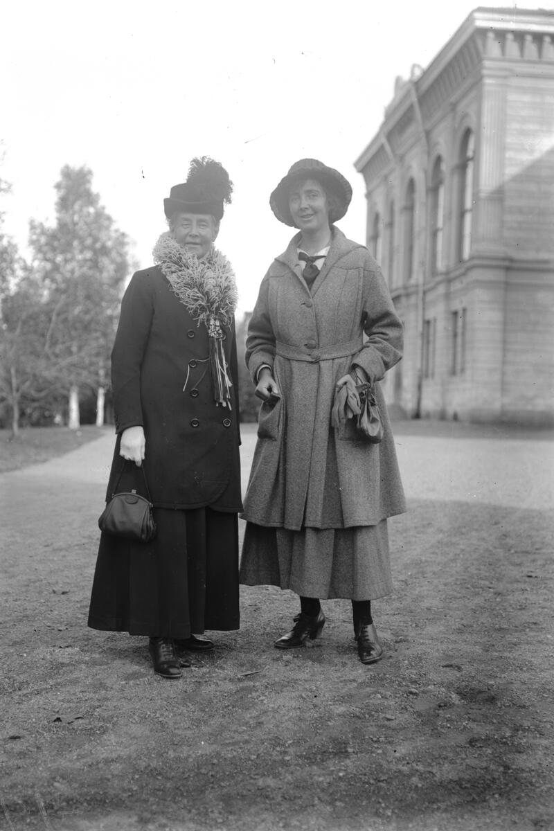 Två äldre kvinnor som står framför läroverkets i Härnösand framsida.