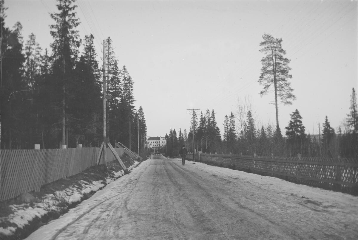 En väg som är omgiven av staket. Vägen går mot dövskolan.