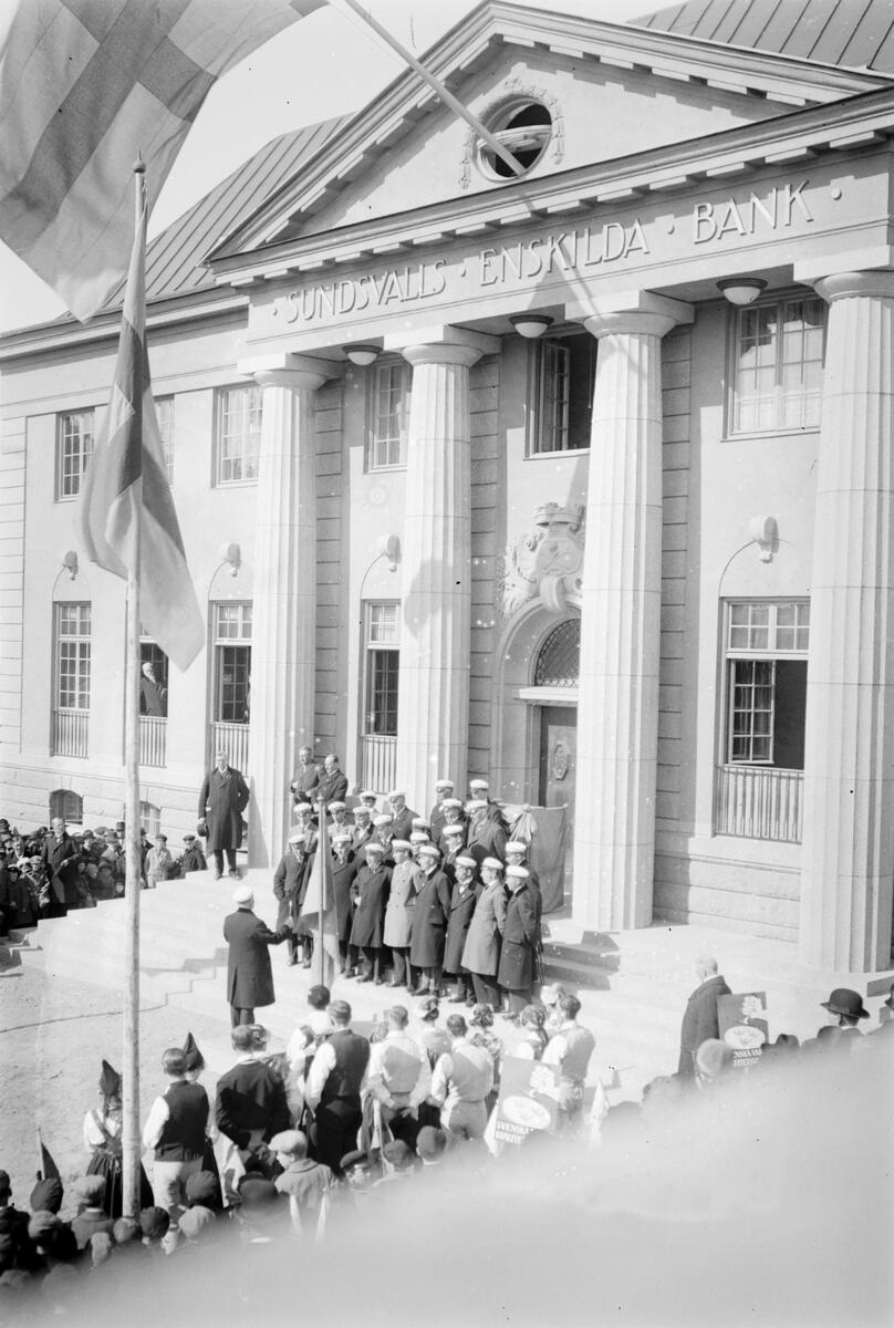 Sjungande studenter framför Sundsvallsbankens byggnad på torget i Härnösand.