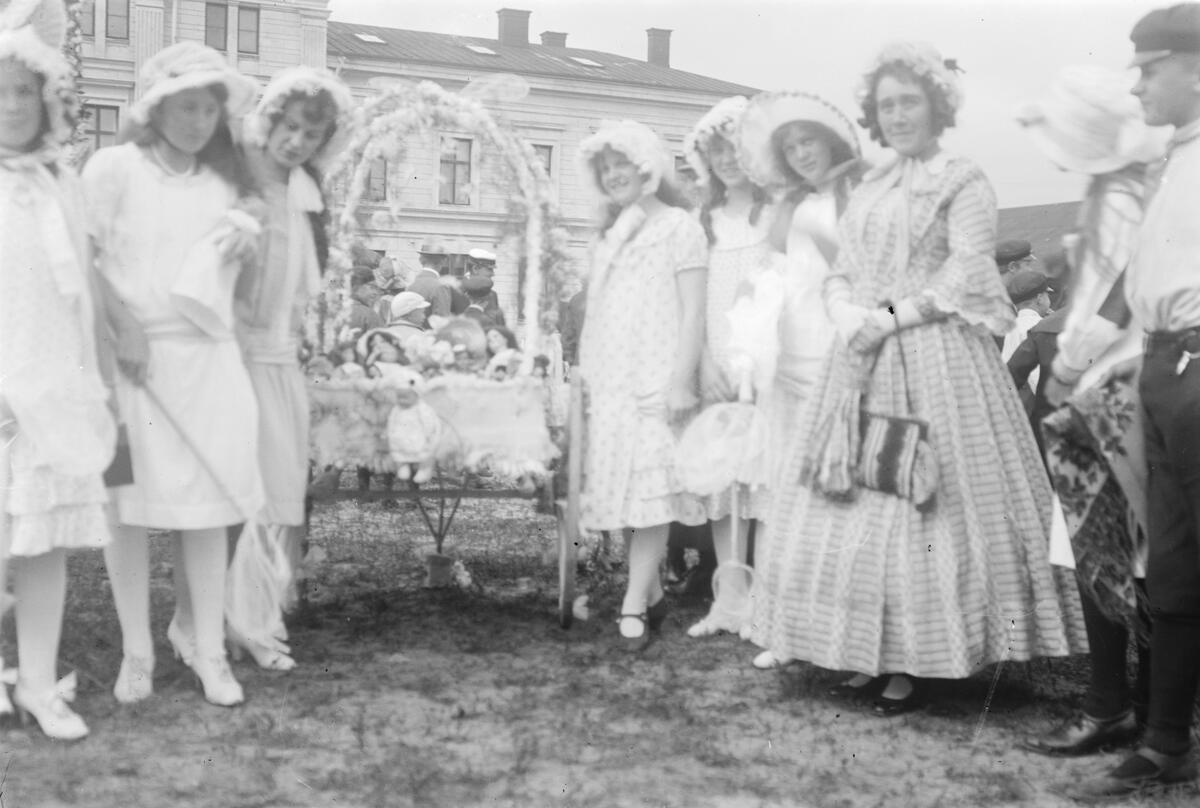 En fest vid läroverket i Härnösand. Flickor står samlade vid en rikt utsmyckad vagn.