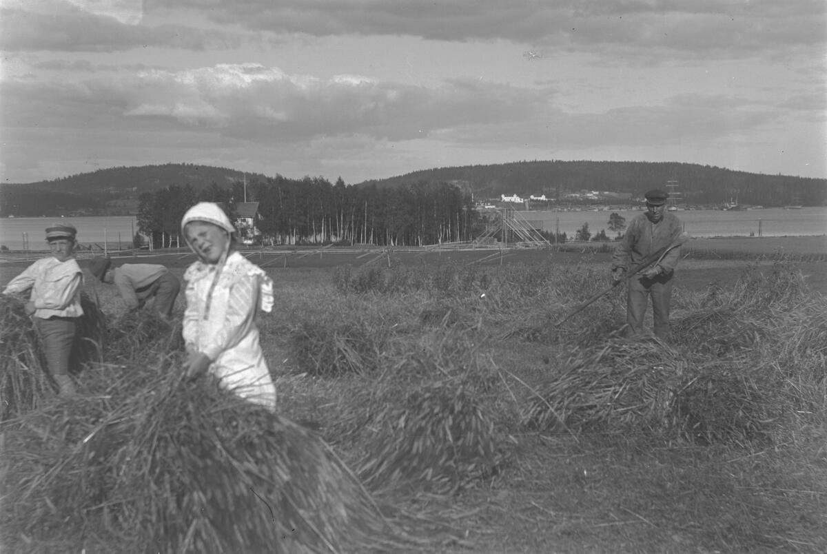 Slåtter. Till höger en man med en lie. Till vänster en flicka och en pojke som samlar upp höet.