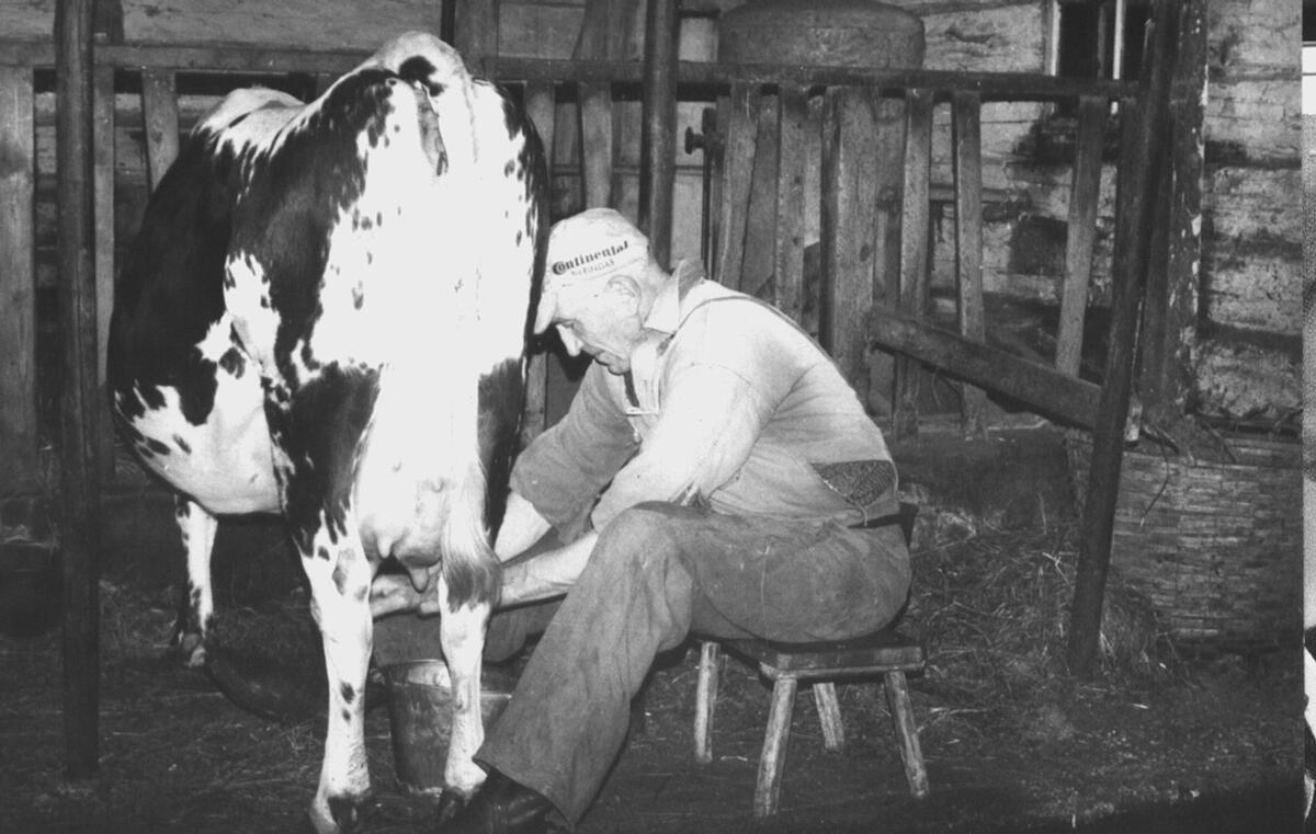 Elias Svensson (Anna-Lisas farbror) den 9 januari 1971. Han mjölkar för sista gången den sista kon på gården. I Ladugården fanns bås för 10 kor. Så många kor hade de inte när Anna-Lisa var barn, men tillsammans med kvigor kunde de kanske fylla båsen. De hade även får, getter, grisar och höns. Dessutom hade de två märrar så det kunde vara 3-4 hästar när stona fölade.