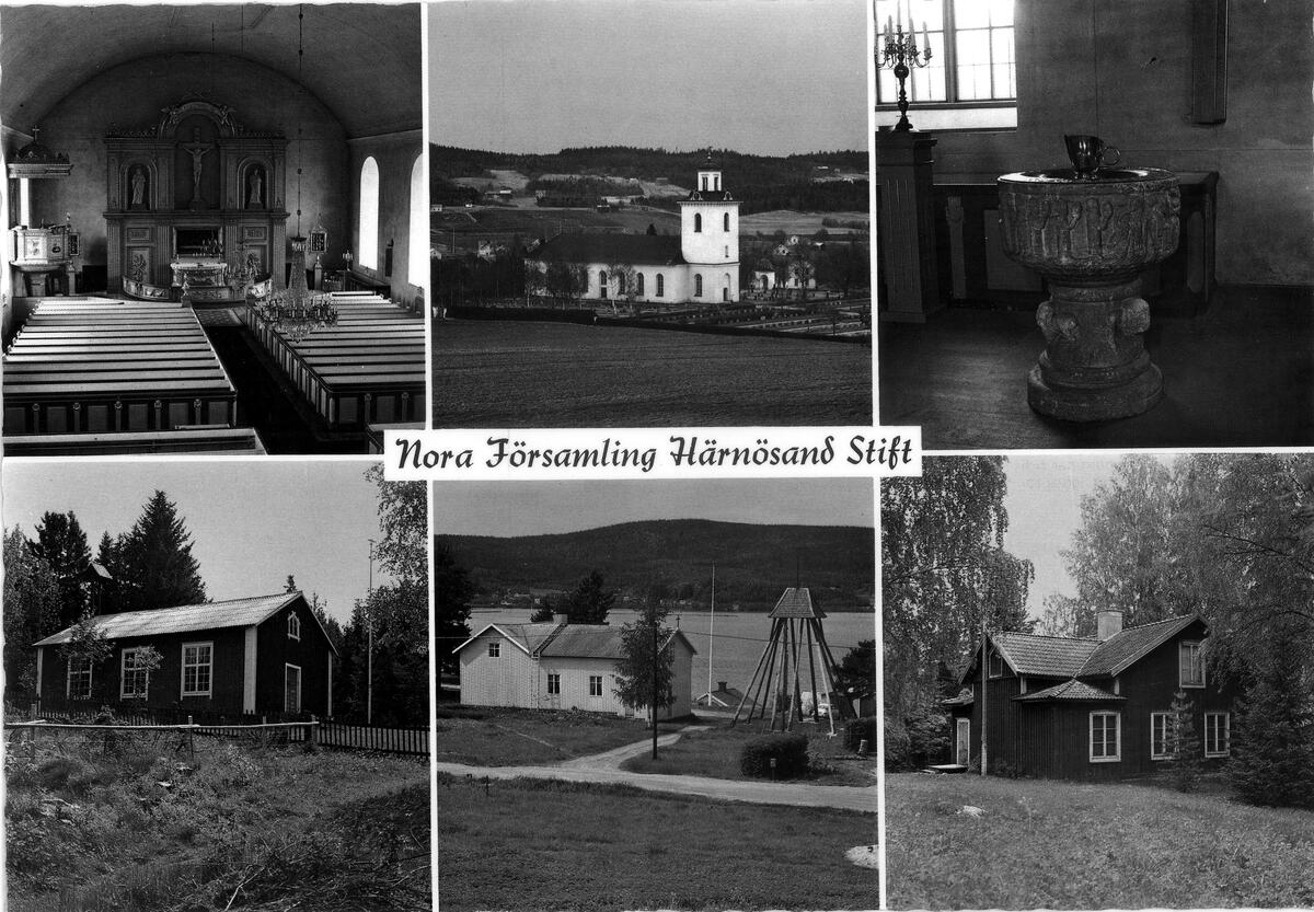 Nora kyrka i Ångermand byggdes åren 1804-1806 av den i landskapeet kände kyrkobyggaren Simon Geting från Åbord. Altaruppsatsen tillkom i samband med restaureringen 1858. Apostlaskulpturerna (Petrus och Johannes) är utförda i trä av Norasonen konstnären Hampe Svanberg 1914. Dopfuntetn i gotländsk sandsten är en av kyrkans verkliga klenoder. Berghams kapell med anor från 1700-talet torde ha byggts på begäran av de sk. gävlefiskarna, som bedrev säsongsfiske vid Berghamn och andra mellannorrländska fiskelägen. Klockestrands församlingshem invigdes 1943. Klockstapeln uppfördes 1957. Lövviks församlingshem har tidigare varit skola. Det invigdes för kyrkliga uppgifter 1940.