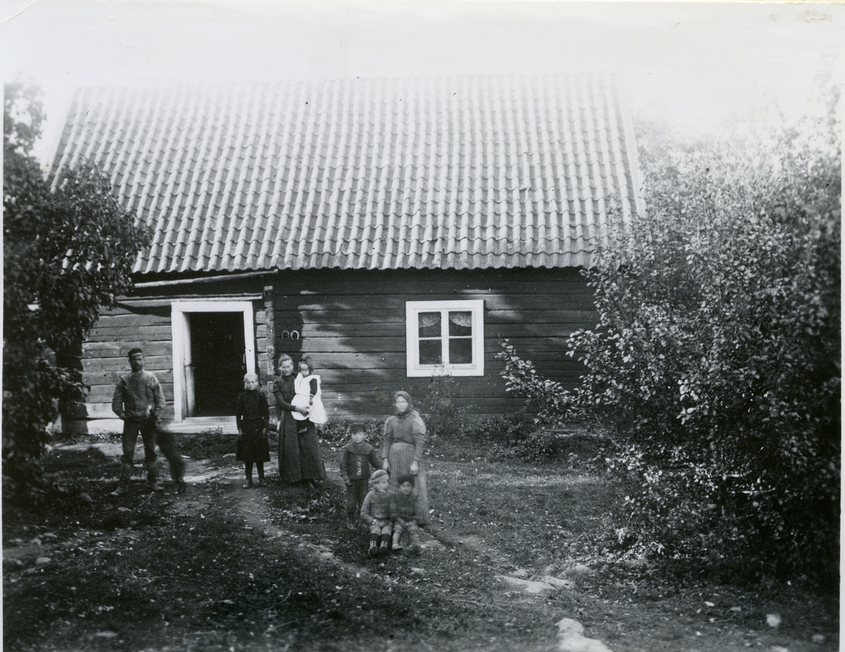 Skräddartorp. Familj stående utanför bostaden. 1900-1910.