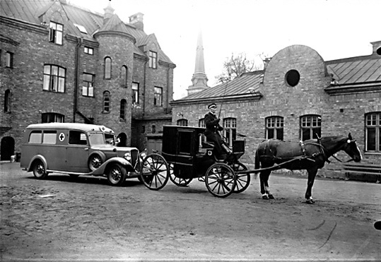 Ambulans och epedemivagn från sidan, utanför Västerås brandstation.