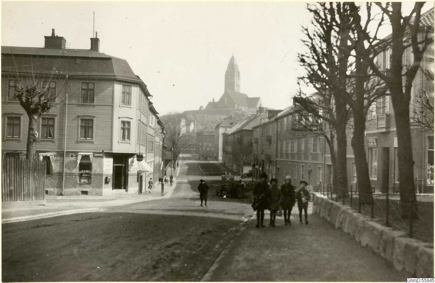 Sträckningsbild Amiralitetsgatan österut. Fotot taget strax innan korsningen vid Koopmansgatan. I fonden Masthuggskyrkan.