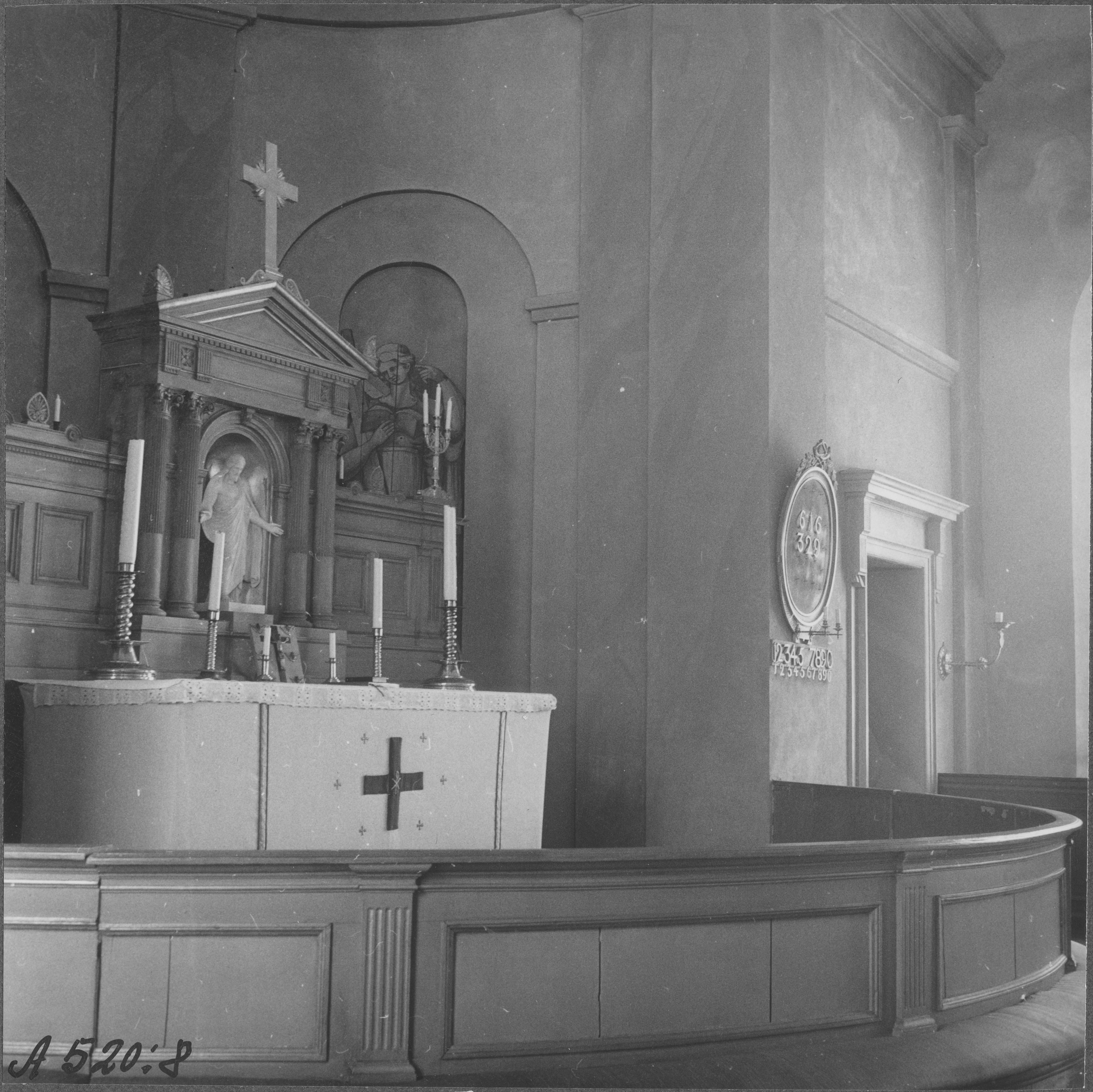 Beskrivning: Altarring och altaruppsats från 1902 med kopia av Thorvaldsens Kristus.