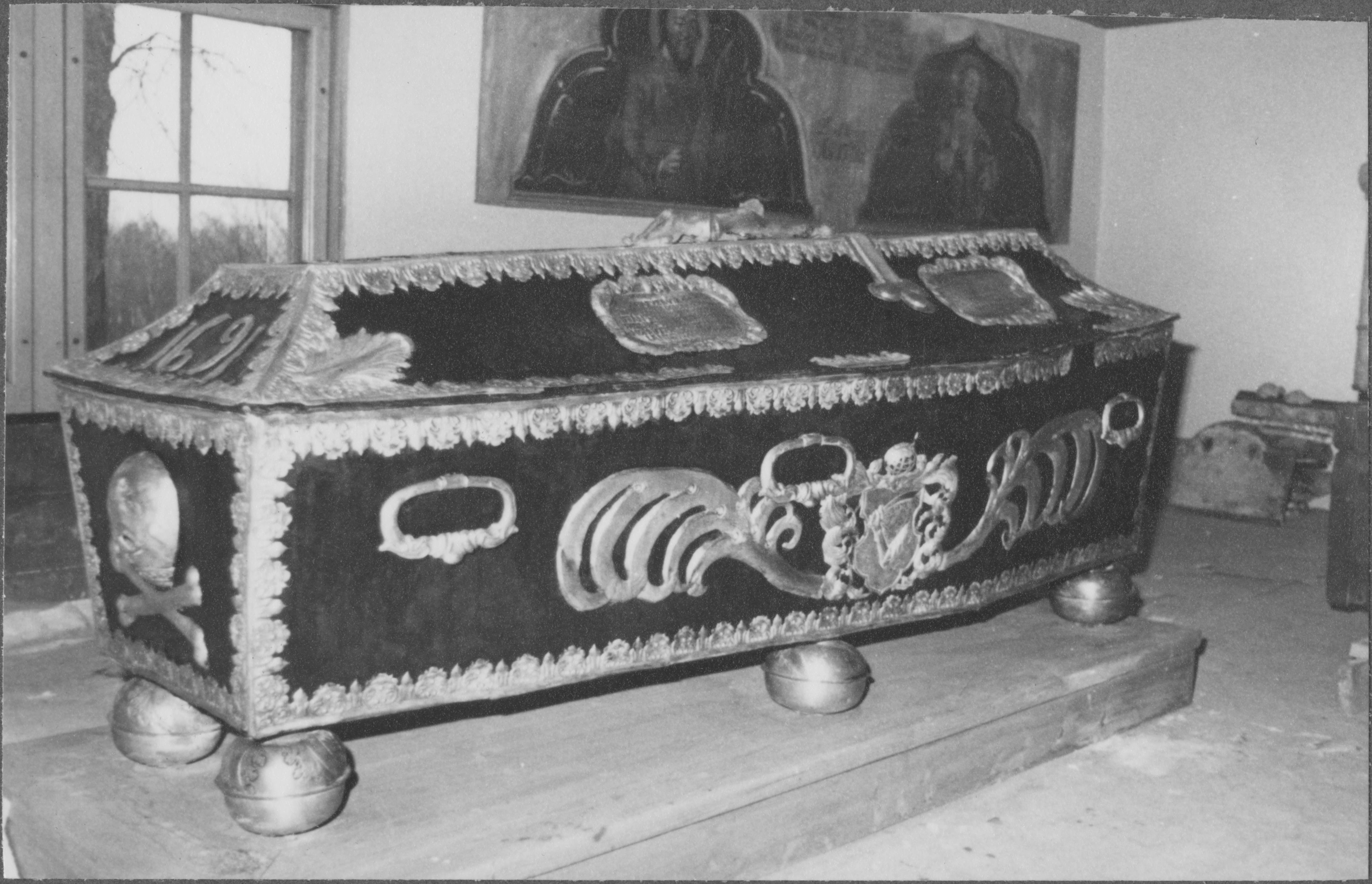 Beskrivning: Kista, Gyllenståhlska kistan. Av furu, brunmålad med järnbeslag. Efter renovering.