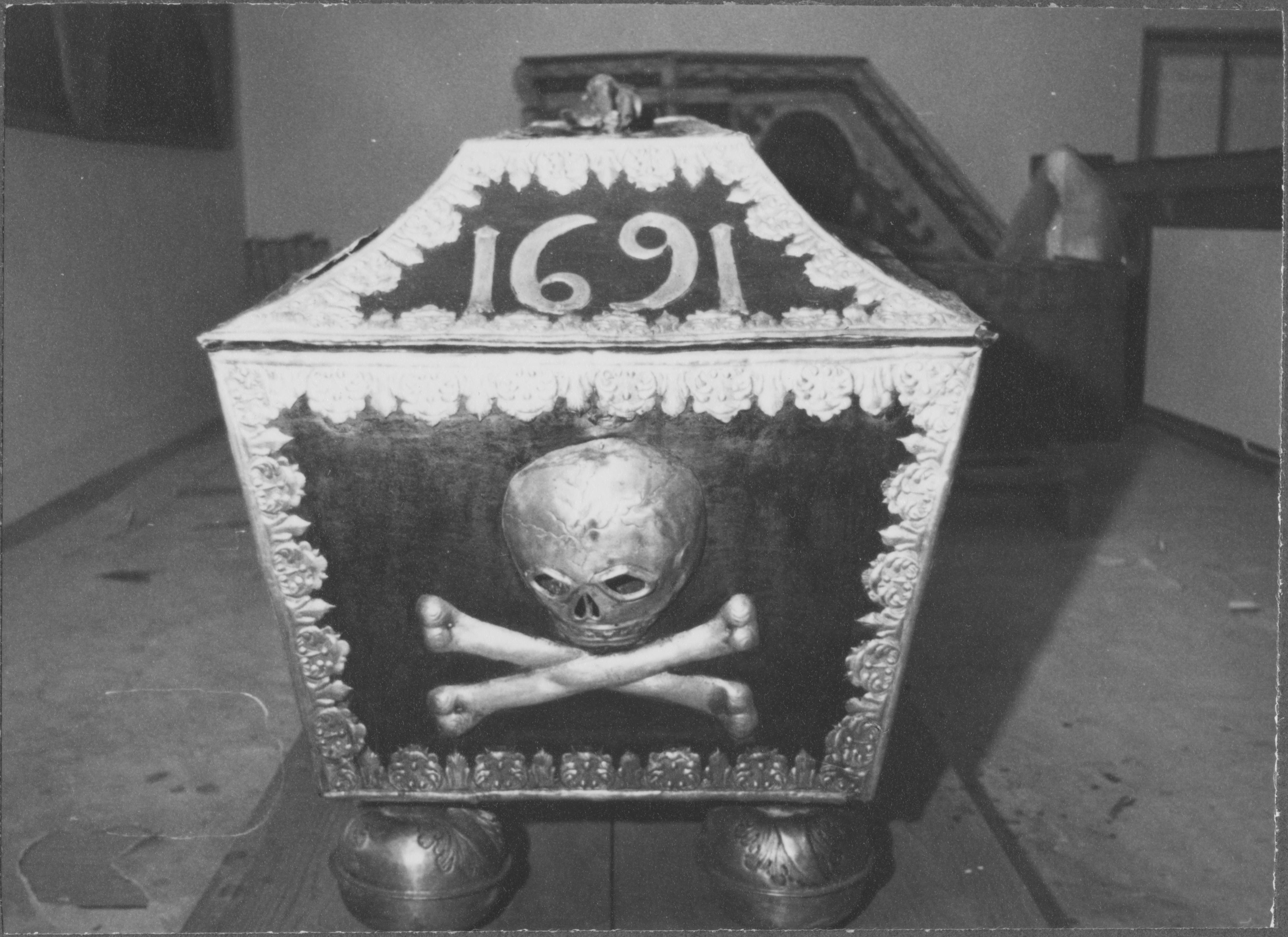 Beskrivning: Kista, Gyllenståhlska kistan. Av furu, brunmålad med järnbeslag. Efter renovering.