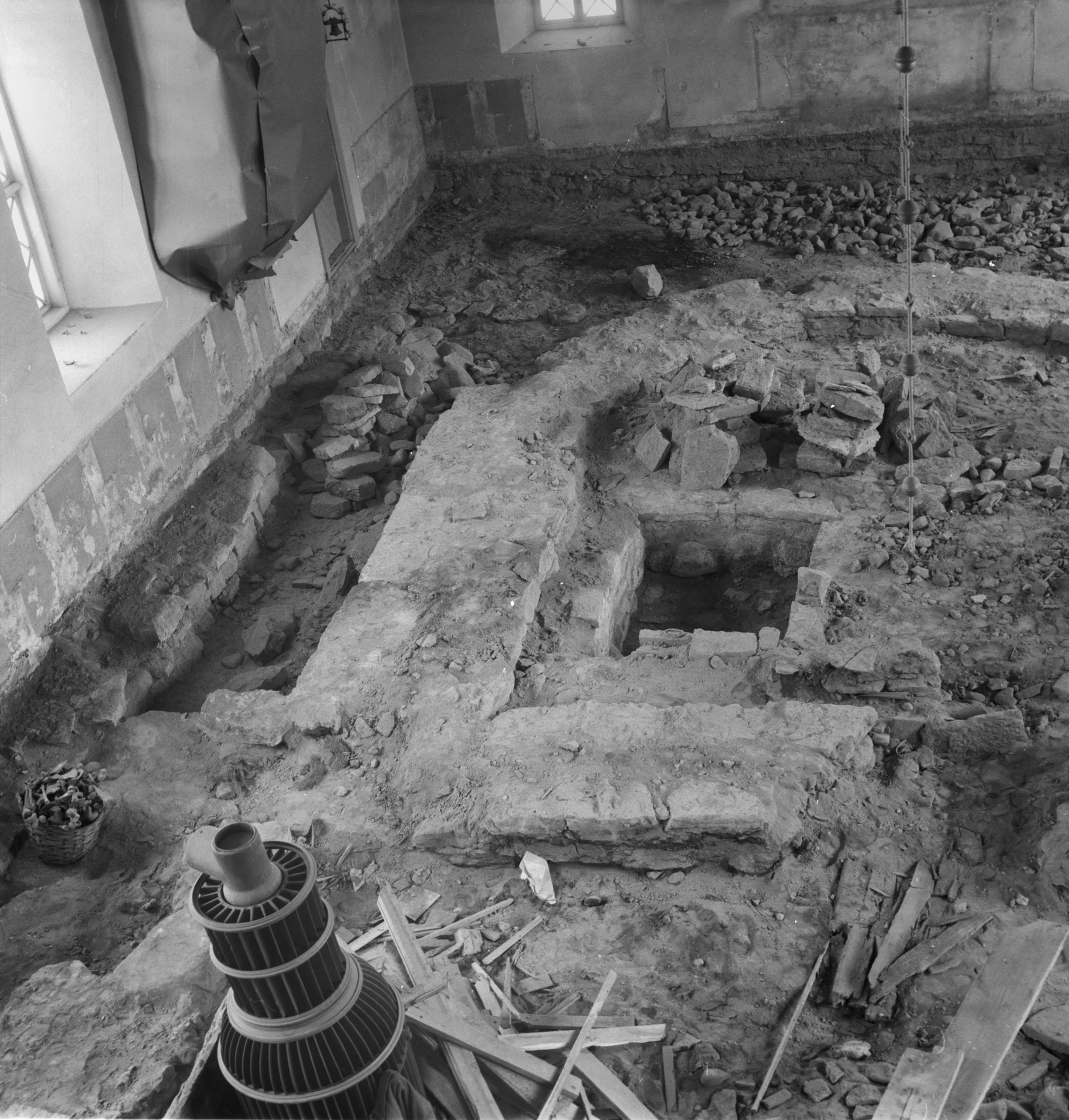 Beskrivning: Från utgrävningar i kyrkan 1954. Undersökning av murrester av gamla kyrkan.