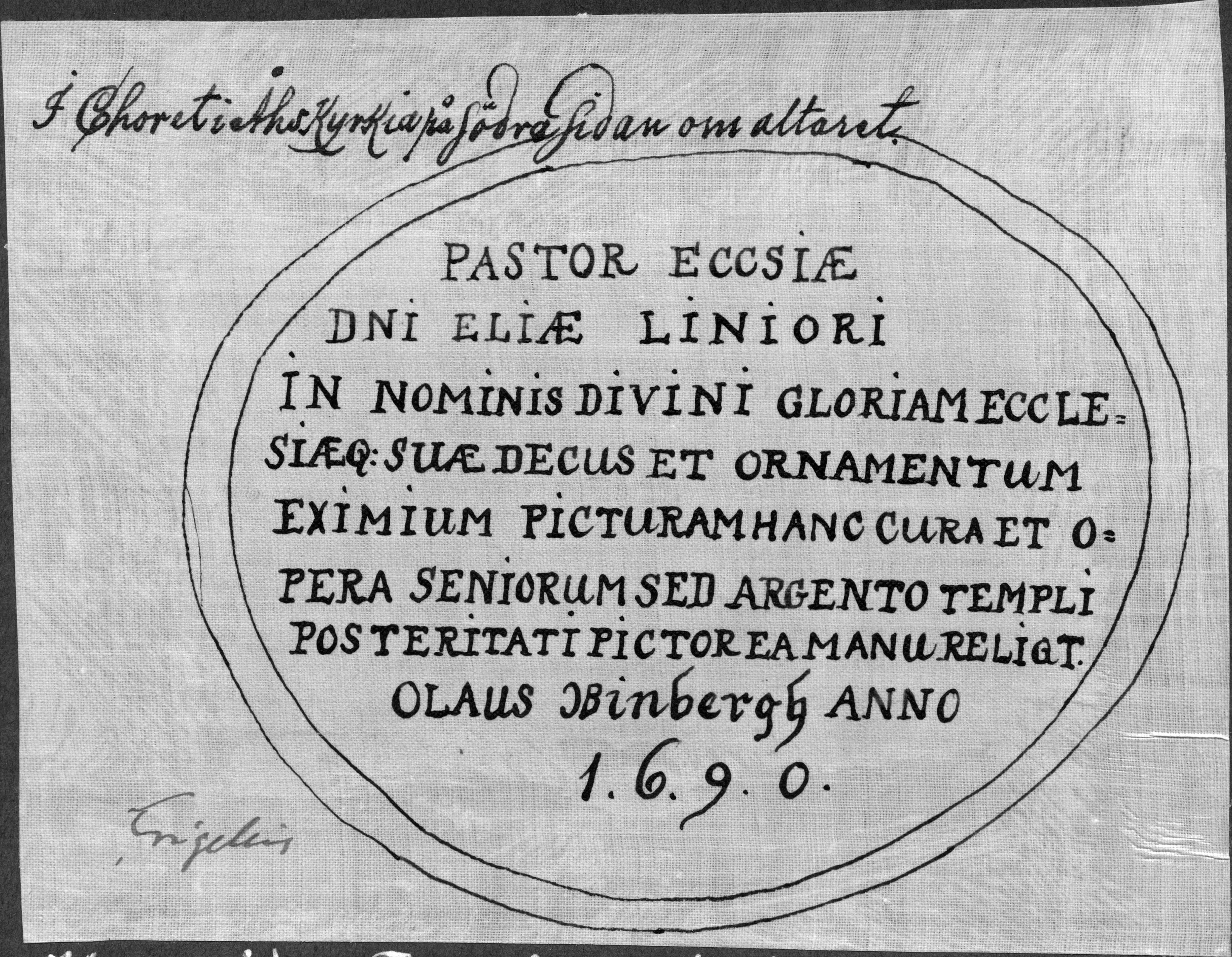 Beskrivning: Teckning föreställande inskription i koret på södra sidan om altaret. Kopia efter Frigelius. Kalmar.