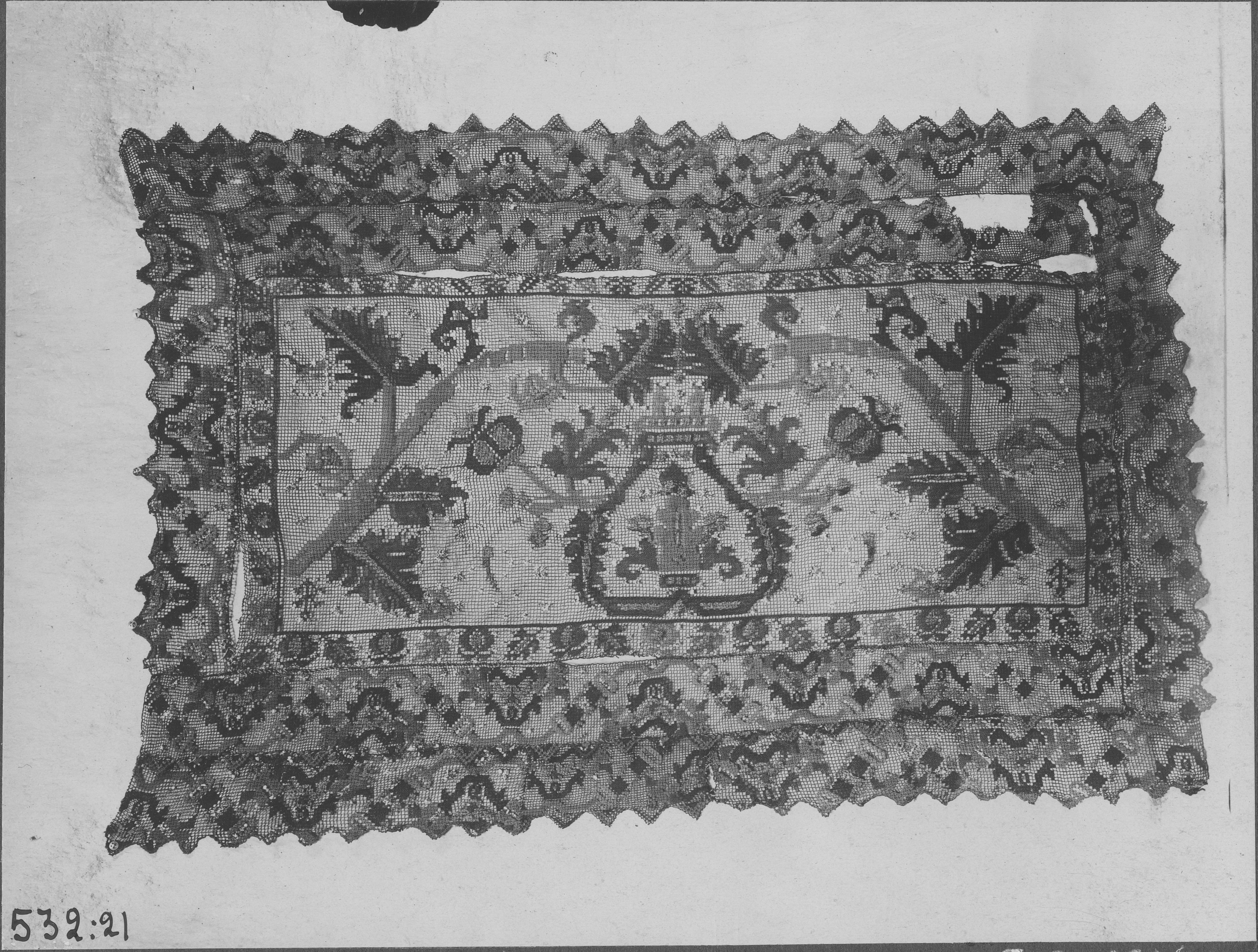 Beskrivning: Brudpäll av silke med flätning av silvertrådar. Italienskt arbete från 1600-talet.