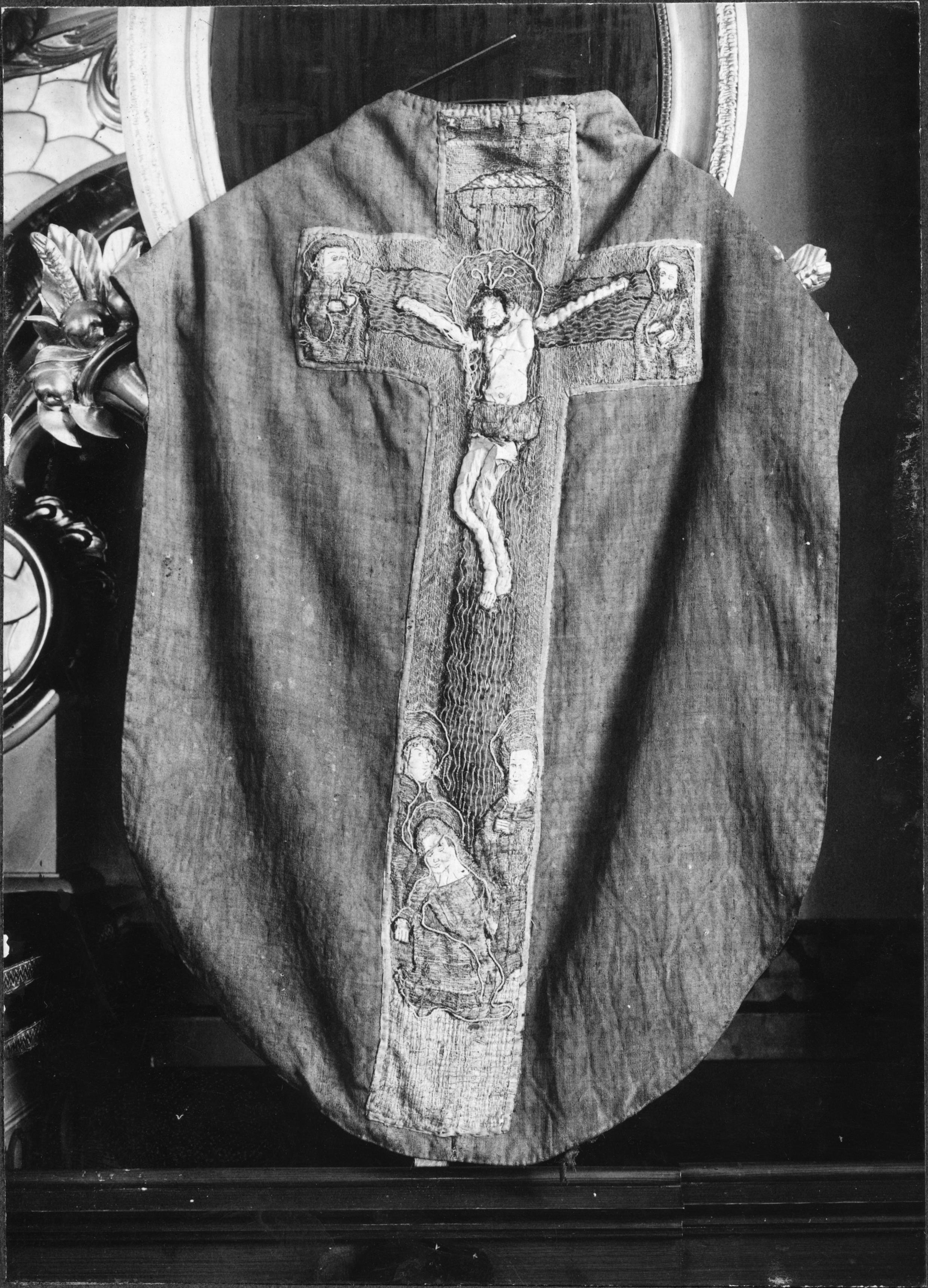 Beskrivning: Mässhake, ryggstycket, av rött fasonerat ylletyg med applikationsbroderi av siden och linnetråd. Krucifix samt fidurer vid korsarmar och fot. 1400-talet, snabbinv.