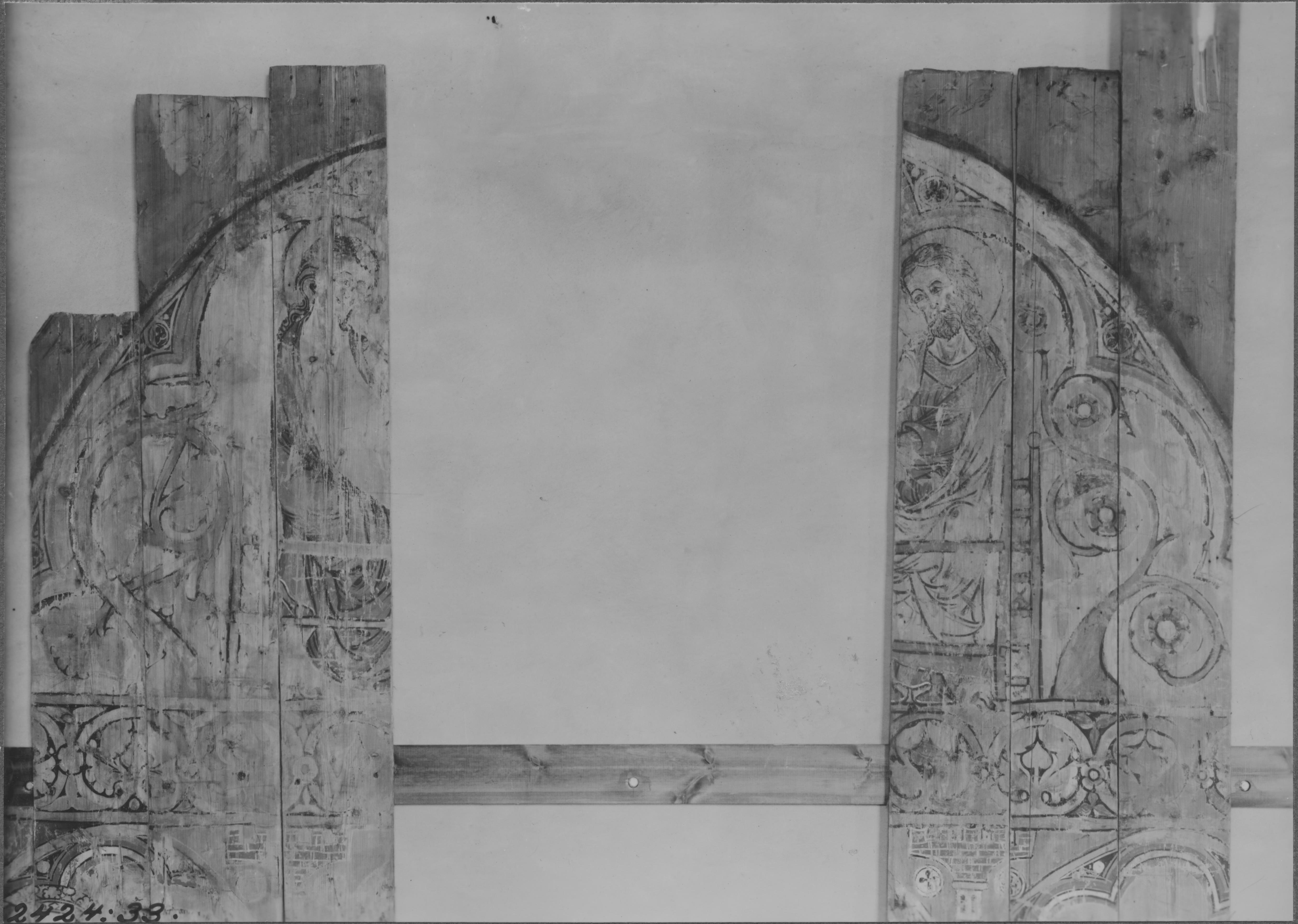 Beskrivning: Del av målad väggpanel. Väggfält II. Evangelisterna Johannes och Lukas.