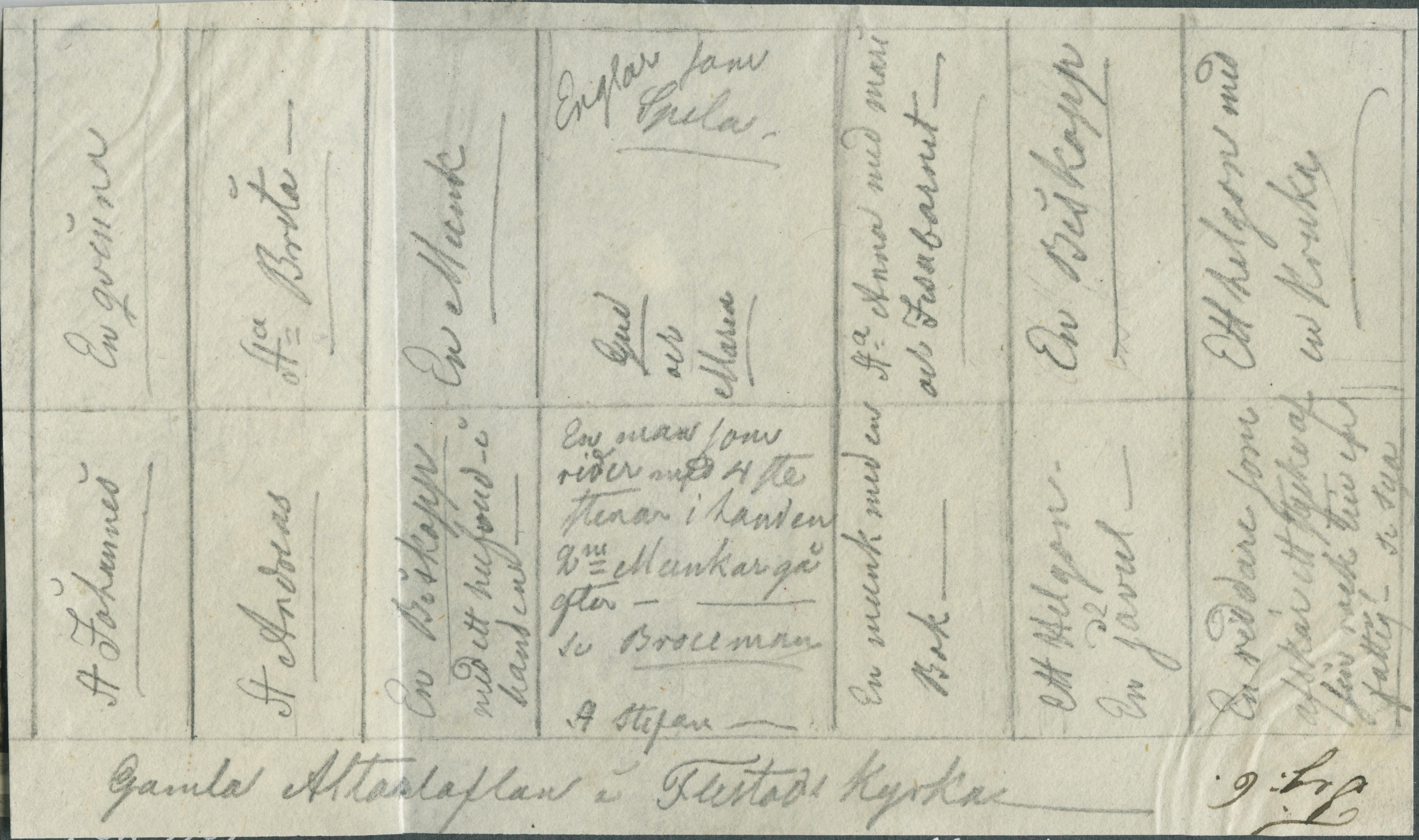 Beskrivning: Ritning med anteckningar gällande gamla altartavlan.