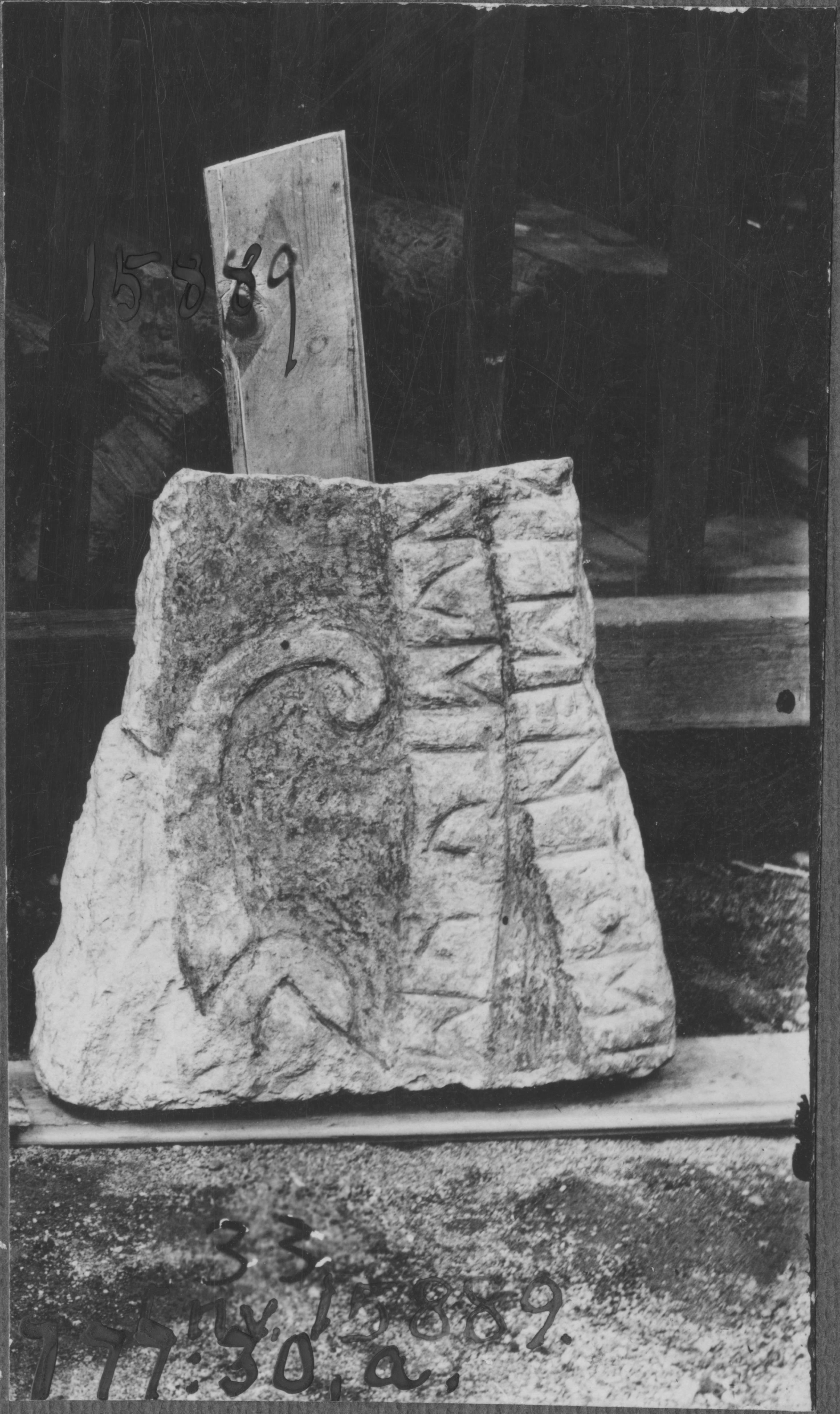 Beskrivning: Gravhäll till gravmonument, så kallad Eskilstunakista, fragment. Från 1100-talets slut.