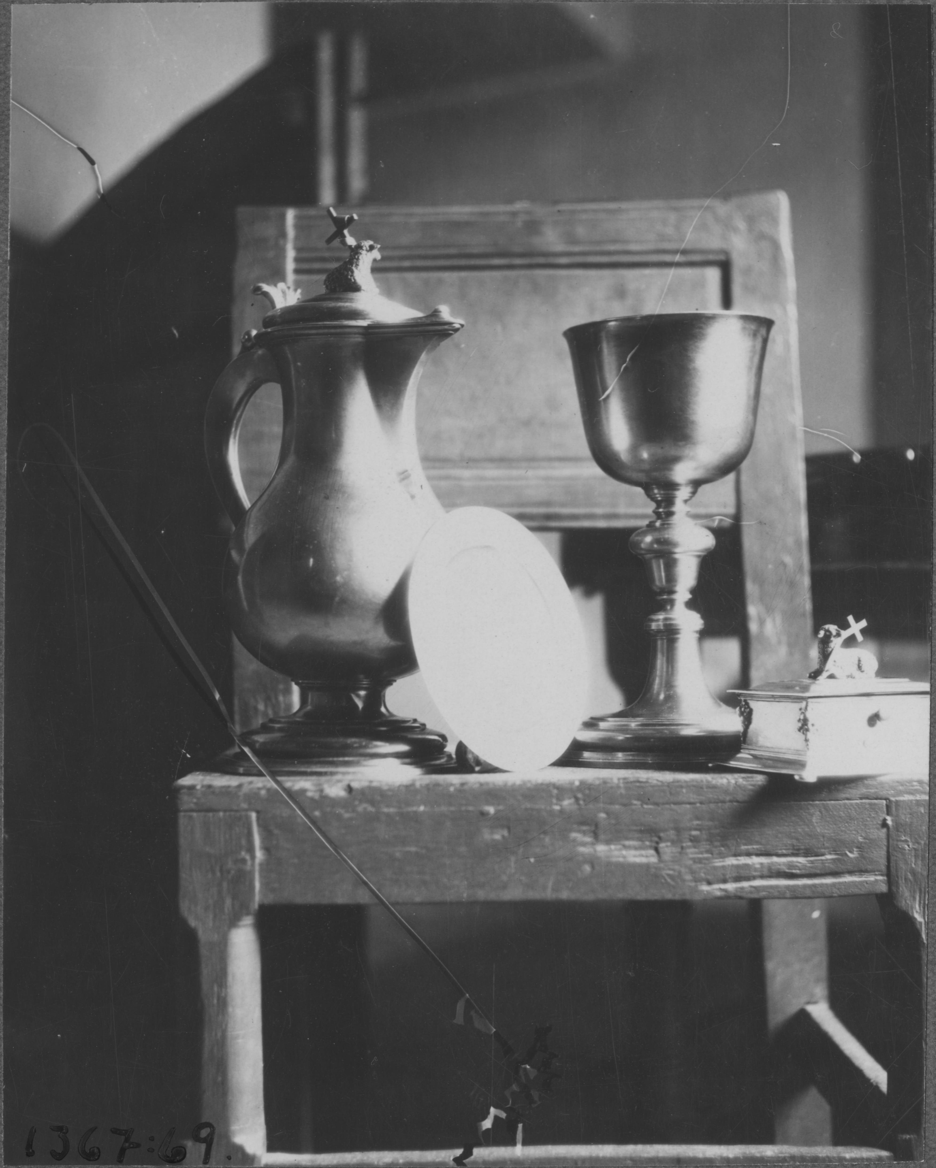 Beskrivning: Kanna av silver, helt förgylld. Päronformad. På locket liggande lamm med kors. Anno 1728 ingraverat i botten. Patén av silver, förgylld. Kalk av silver, förgylld. Stor rund skål. I botten ingraverat Anno 1728. Oblatask av silver, helt förgylld. Rektangulär. Blommor och frukter i relief. På locket liggande lamm med kors. Snabbinventering.