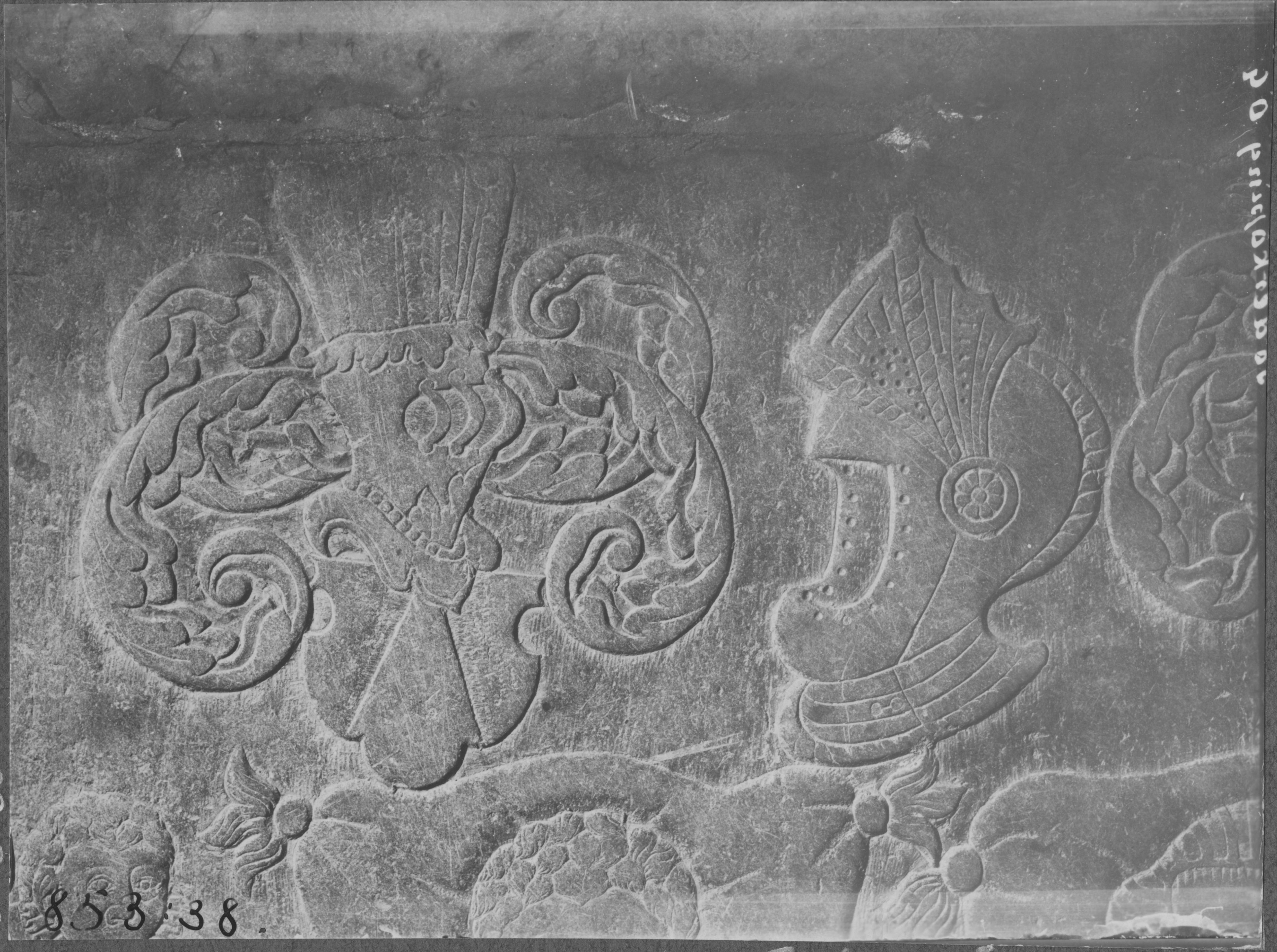 Beskrivning: Gravsten för Karl Holgersson Gera, död 1566 och Kristina Bengtsdotter Färla, död 1560. Detalj.