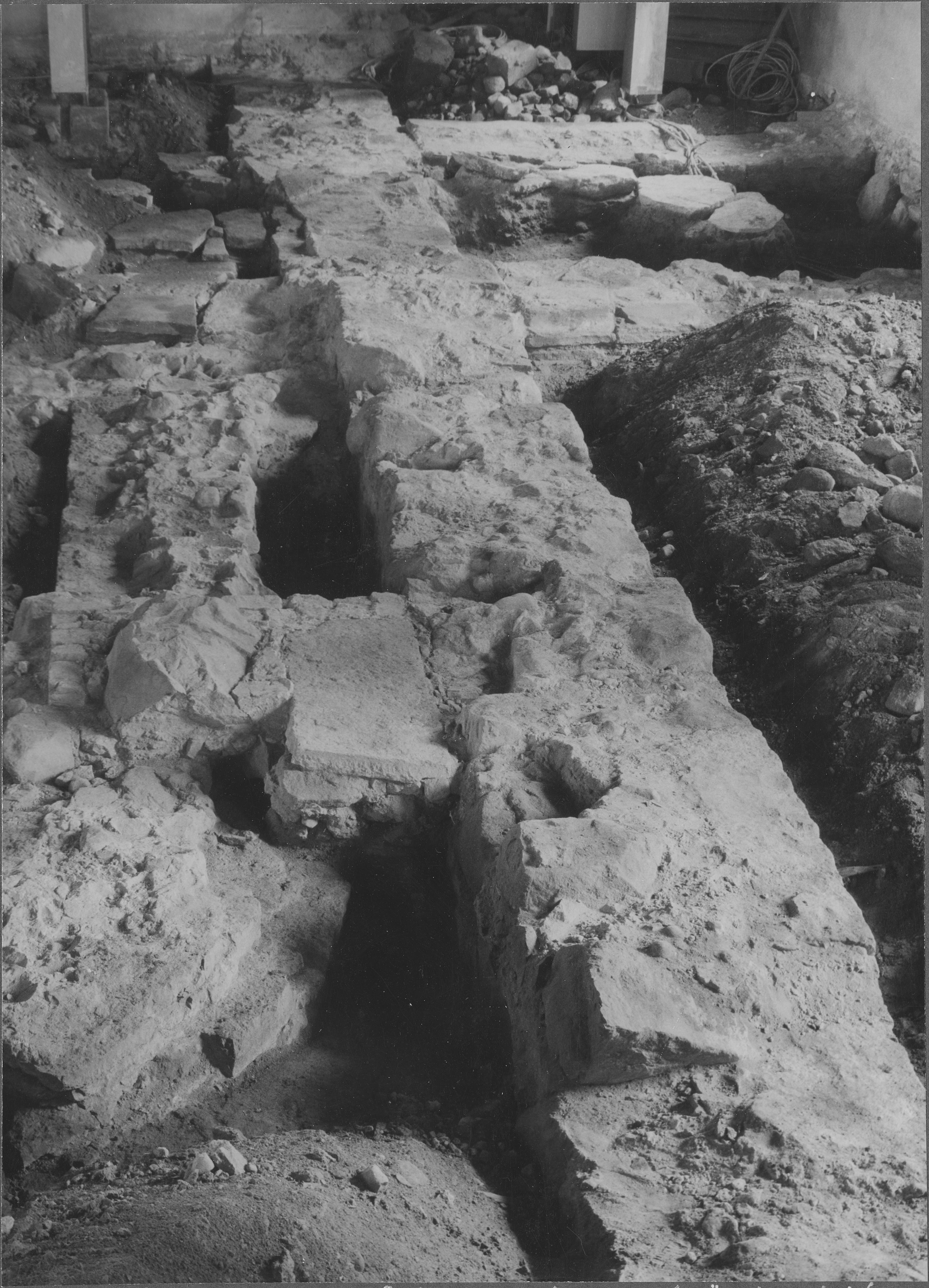 Beskrivning: Norra sidans äldre grundmurar från öster. Till vänster absiden, kormur och golvrest, till höger förlängda långmuren och sakristian.