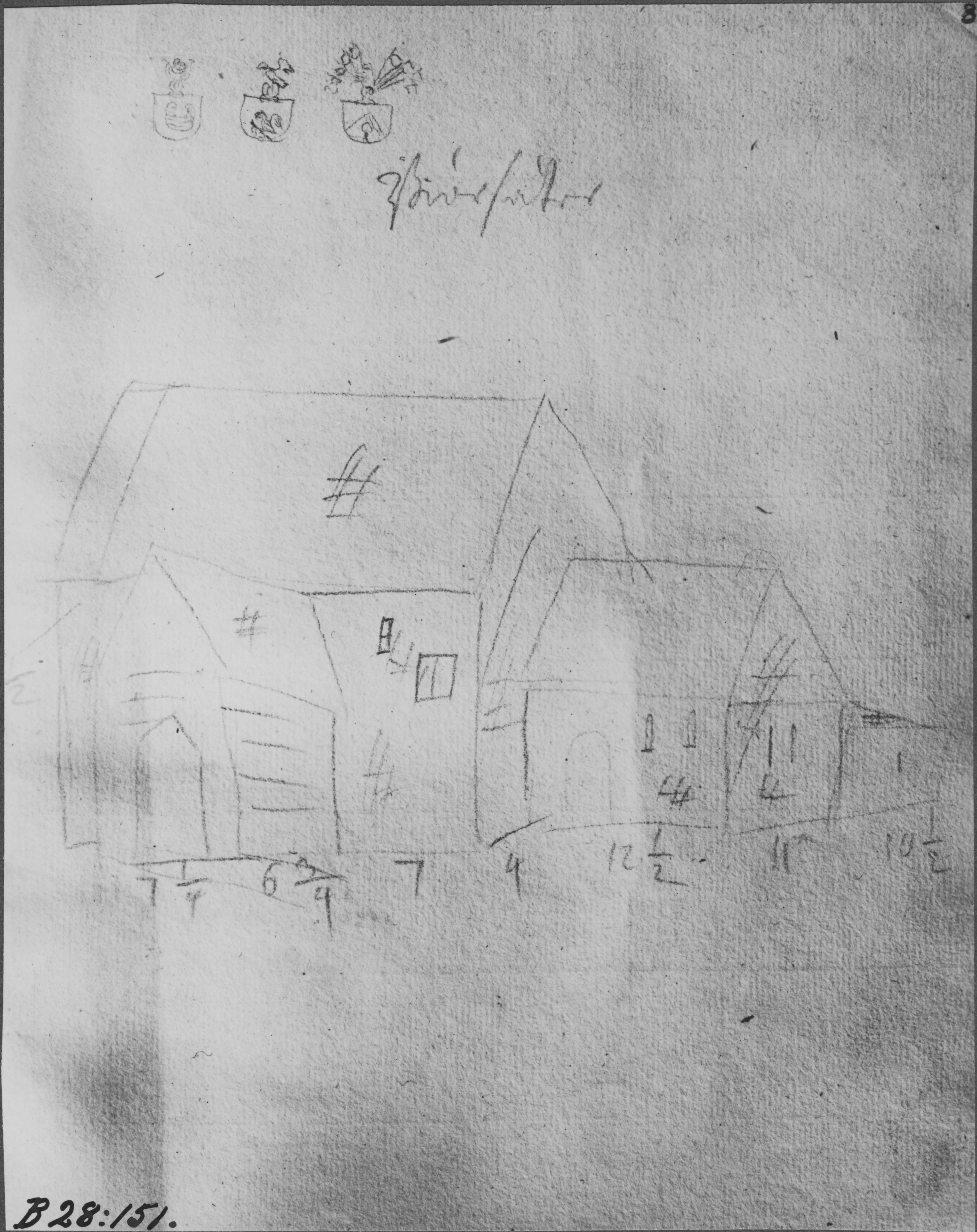 Beskrivning: Exteriör efter skiss av den medeltida träkyrkan. Från 1600-talet.