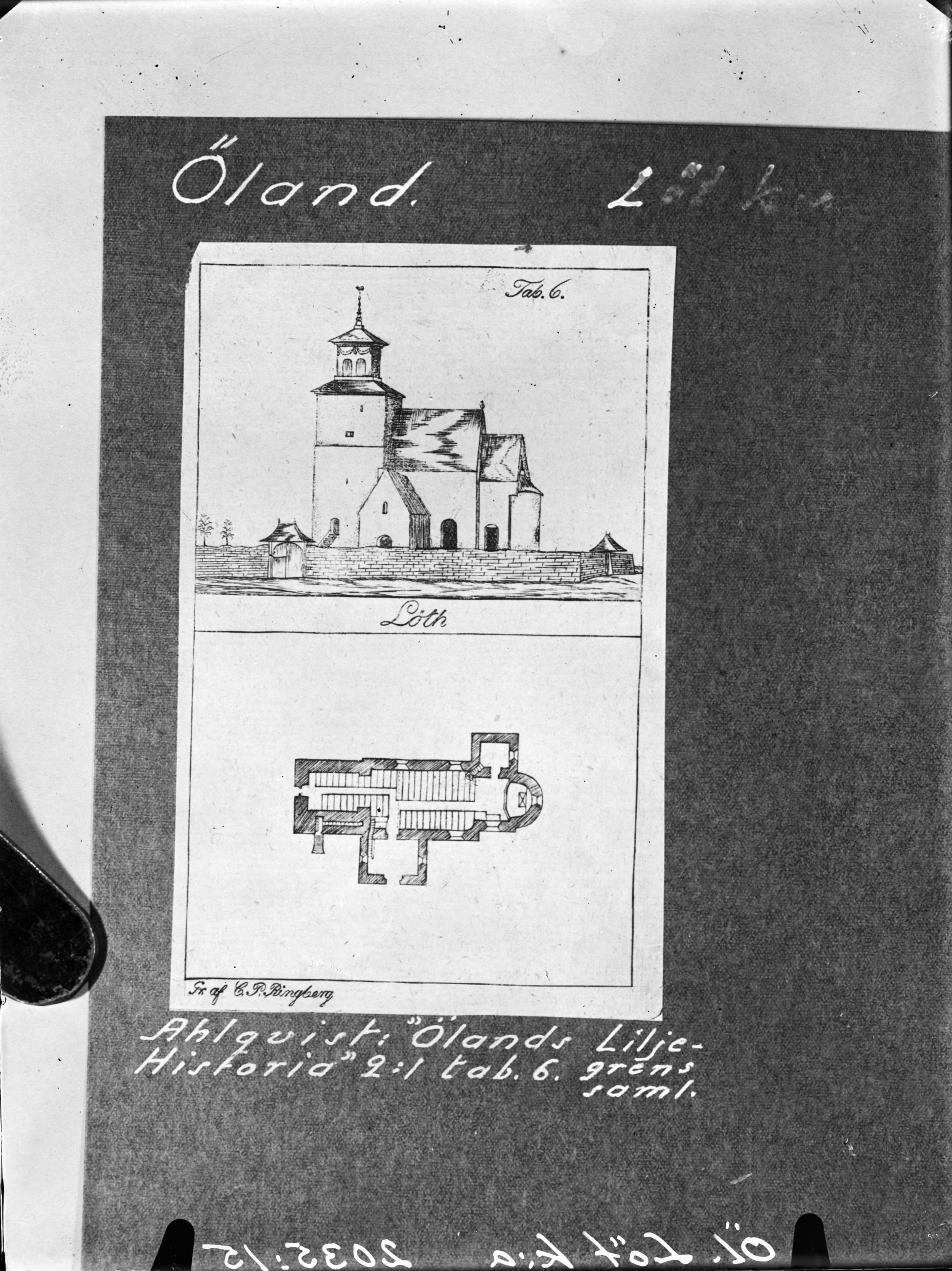 Beskrivning: Teckning av kyrkan, fasad och plan. Ur Ahlqvist Ölands Historia.