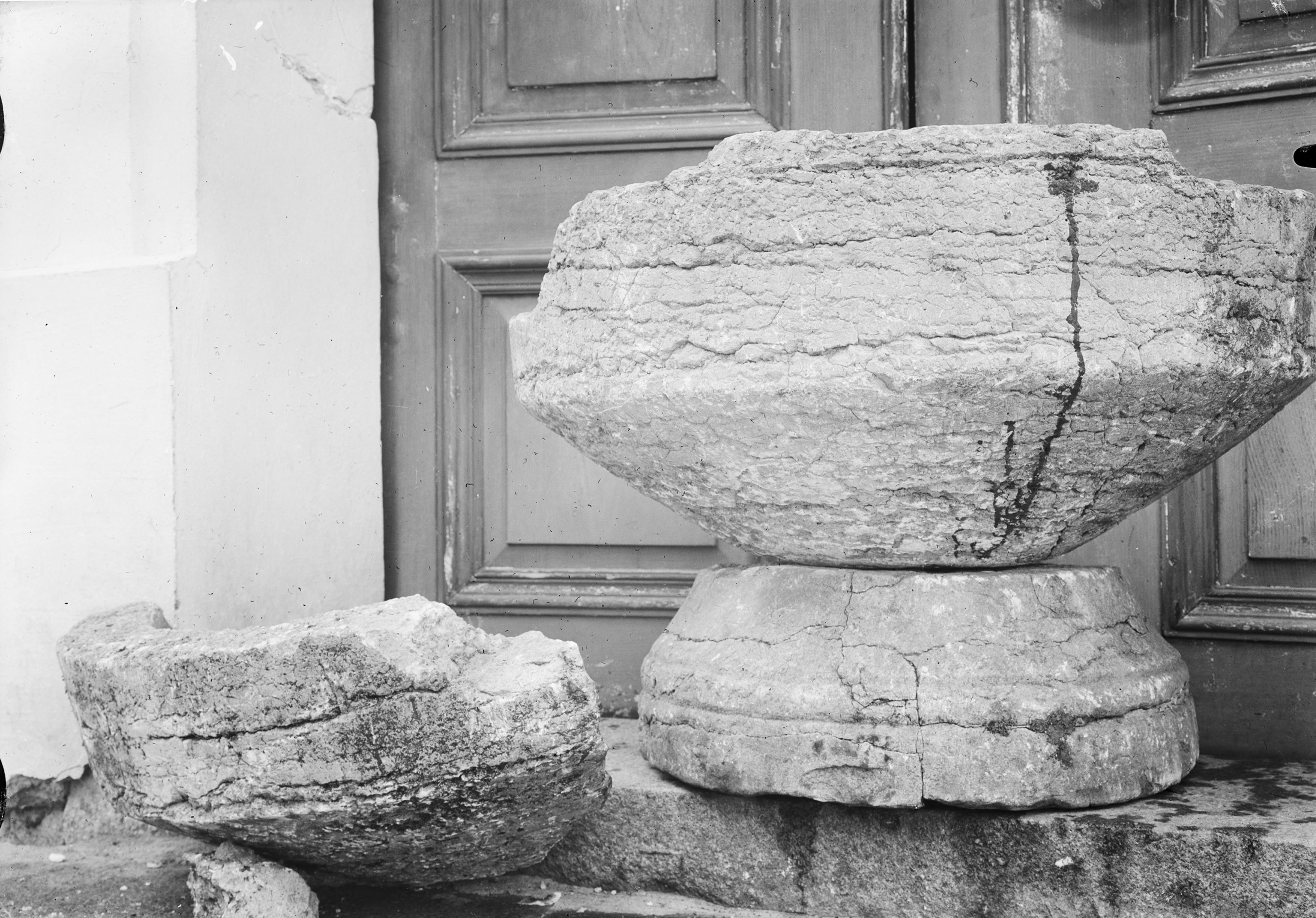 Beskrivning: Dopfat. Kalksten. Två delar, skål och fot. Skålen sönder i två bitar. 1300-talet? Snabbinv.