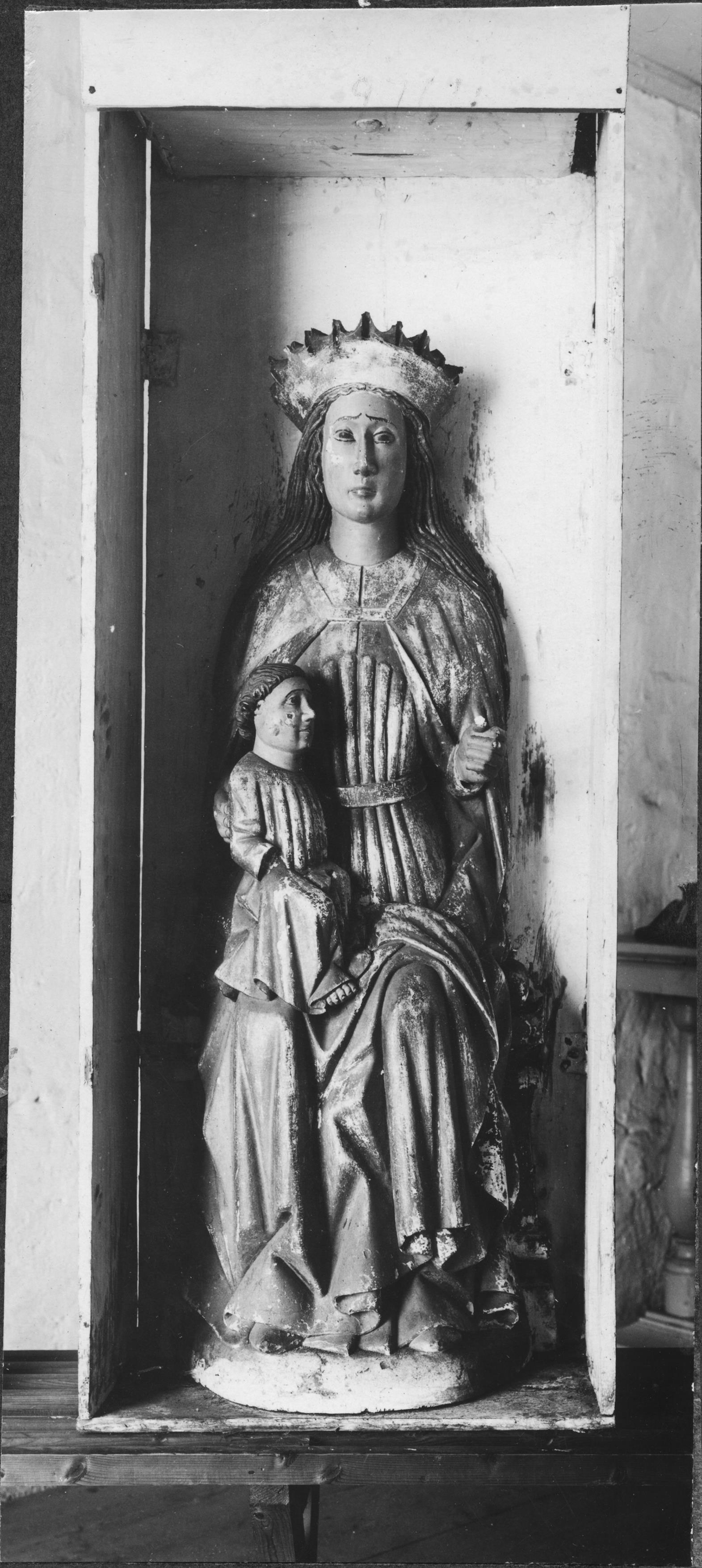 Beskrivning: Madonna. Träskulptur. H. 106 cm. 1500-talets början. Skåpet från senare tid. Härnösandsutst. 1912 nr. 95.