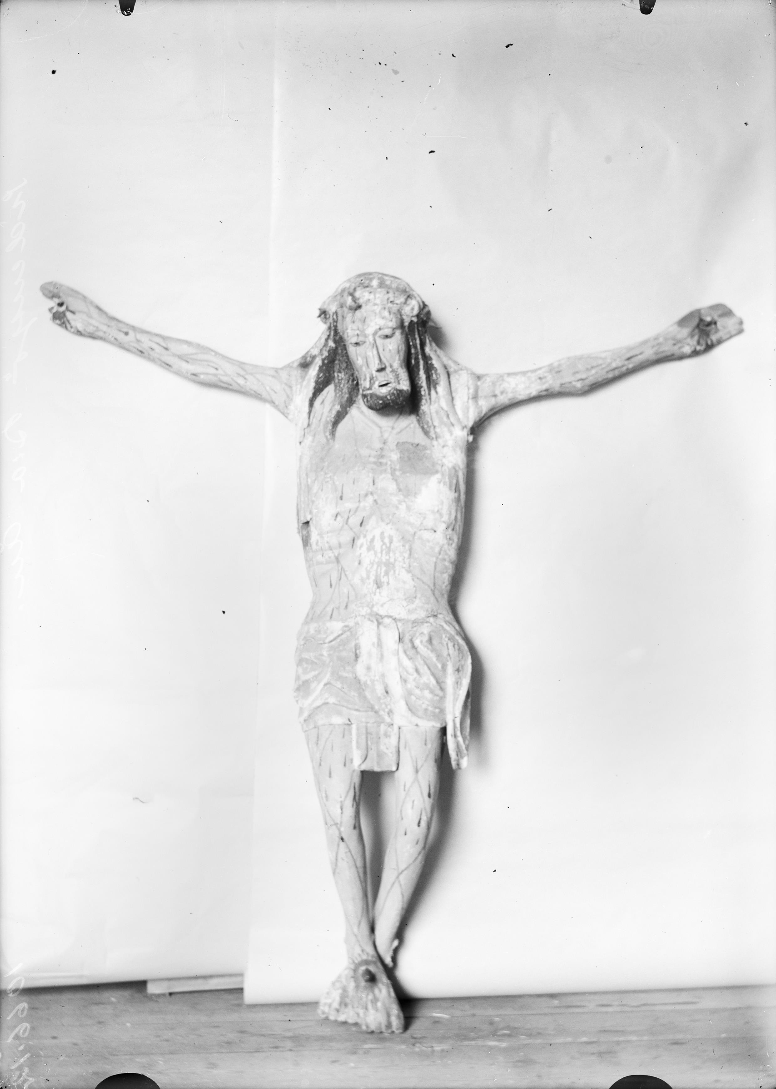 Beskrivning: Kristus till triumfkrucifix. Träskulptur. Törnkrans i ett med huvudet. Förgyllt höftkläde med blå innersida. Kroppen bemålad med bloddroppar. H. 164 cm. 1500-talet. Före restaurering.