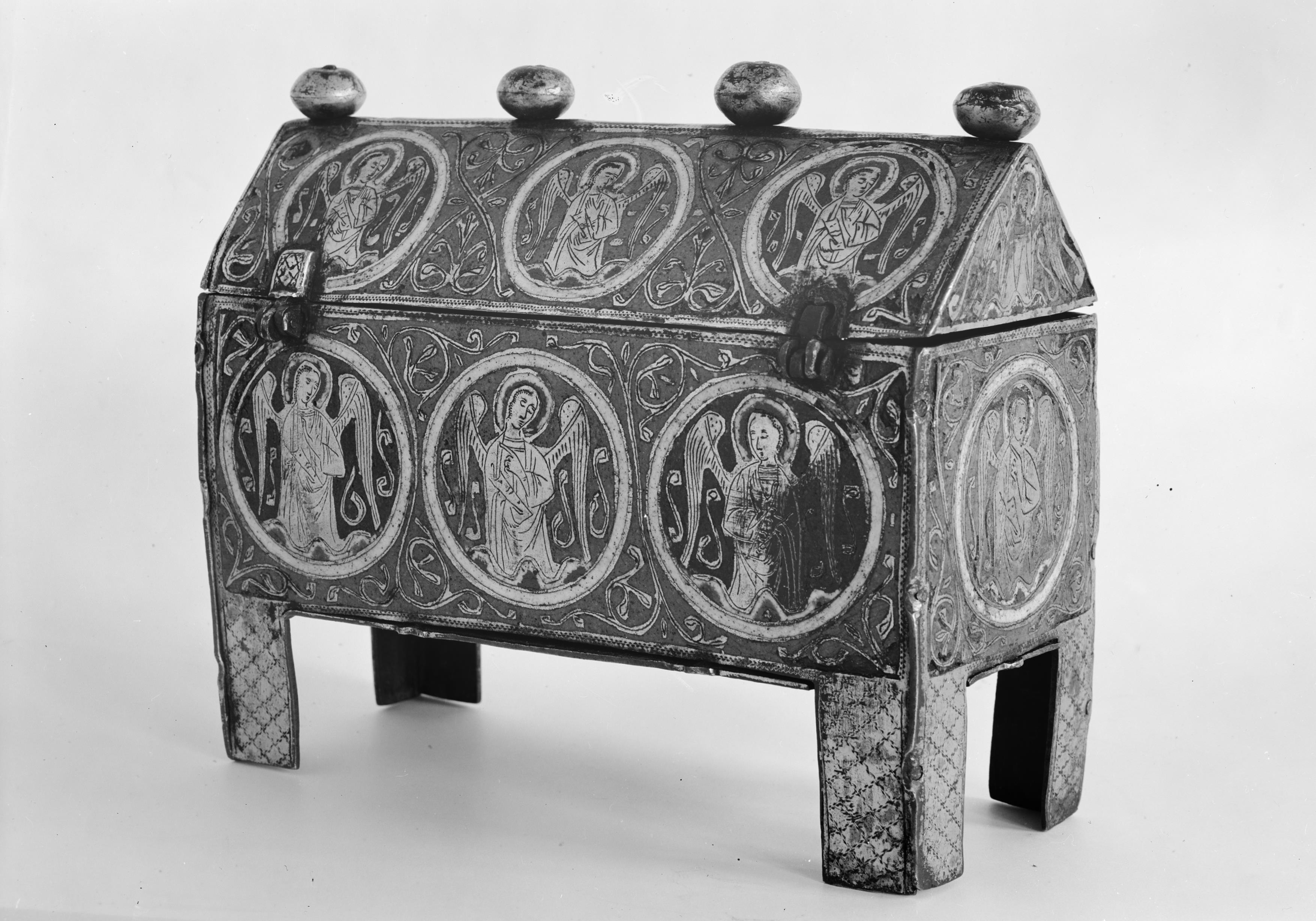 Beskrivning: Relikskrin av koppar, omkring 1200. Franskt arbete.