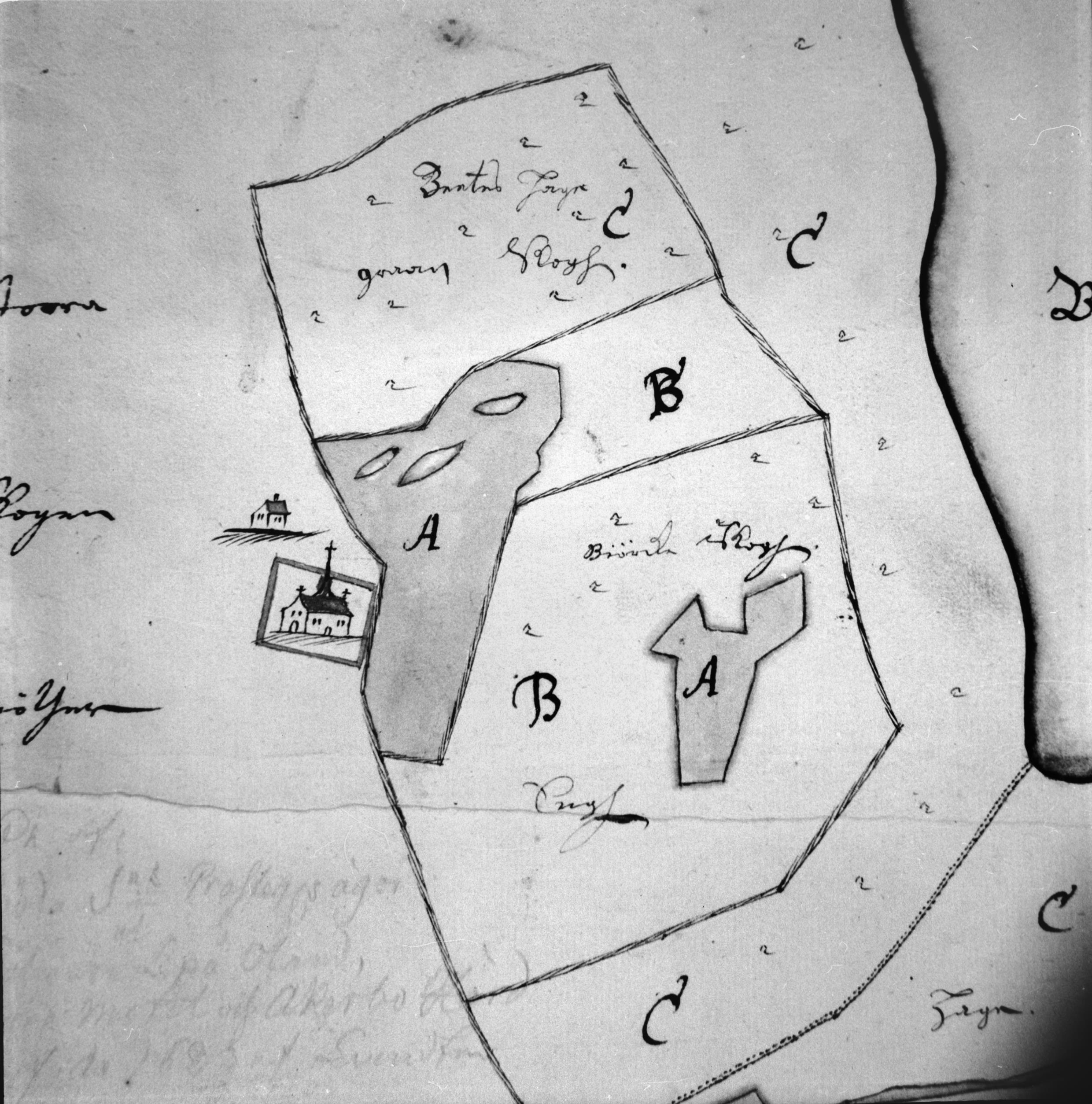 Beskrivning: Teckning av kyrkan, detalj från karta, ur Geometrisk Book af Ölands Norre mooth, 1683.