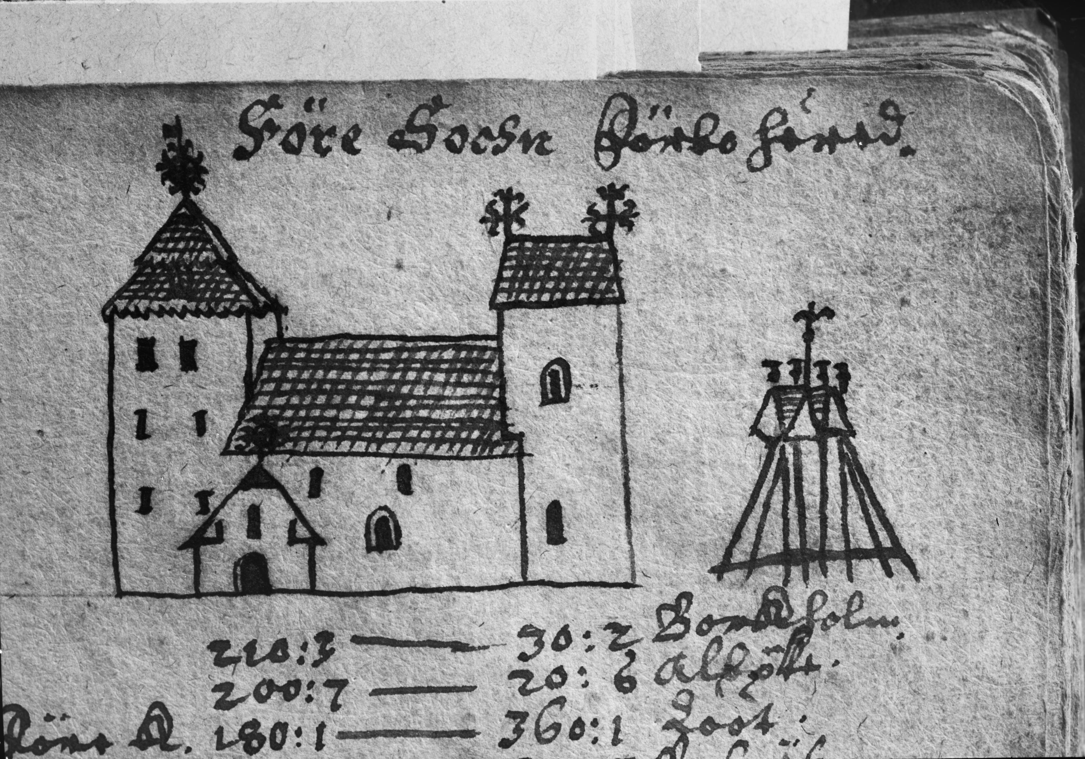 Beskrivning: Teckning av kyrkan från söder, ur Ölands Runstenar av Rhezelius.