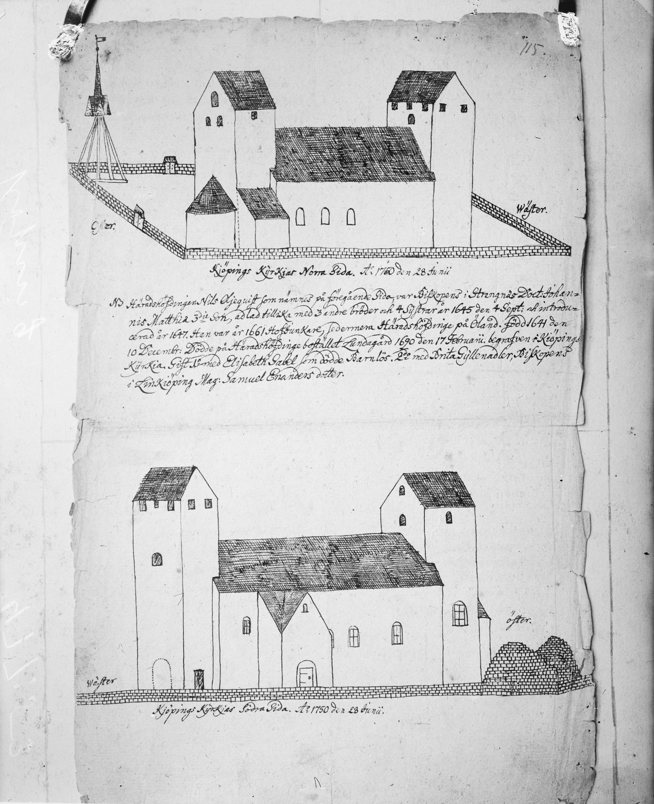 Beskrivning: Teckningar av kyrkan från norr och söder. Ur Frigelius samling. Kalmar läroverks bibliotek.