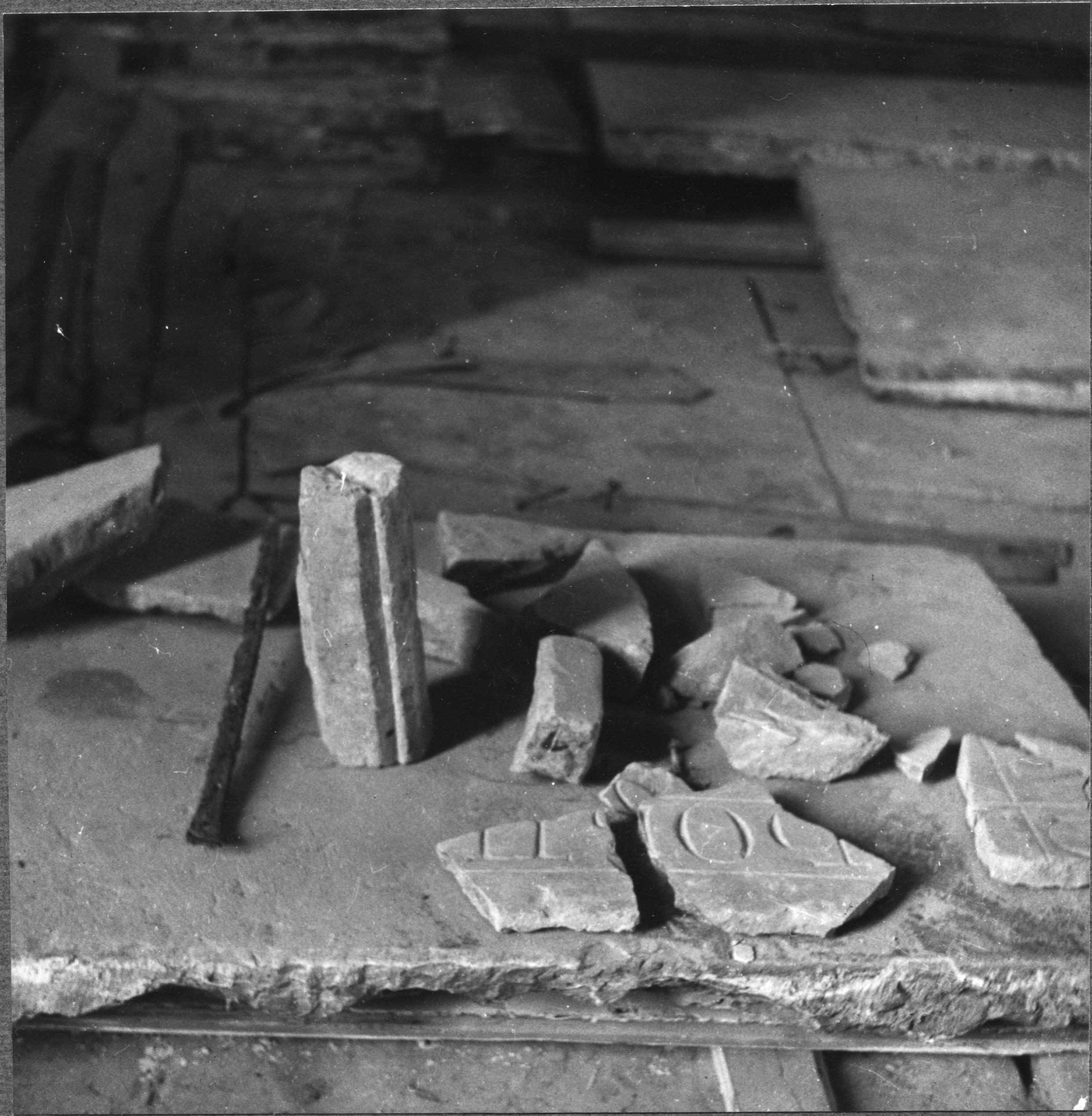 Beskrivning: Restaurering i kyrkan. Fragment av Sigmund de Hornes gravsten, mittpost till fönster mm, funna under korgolvet.