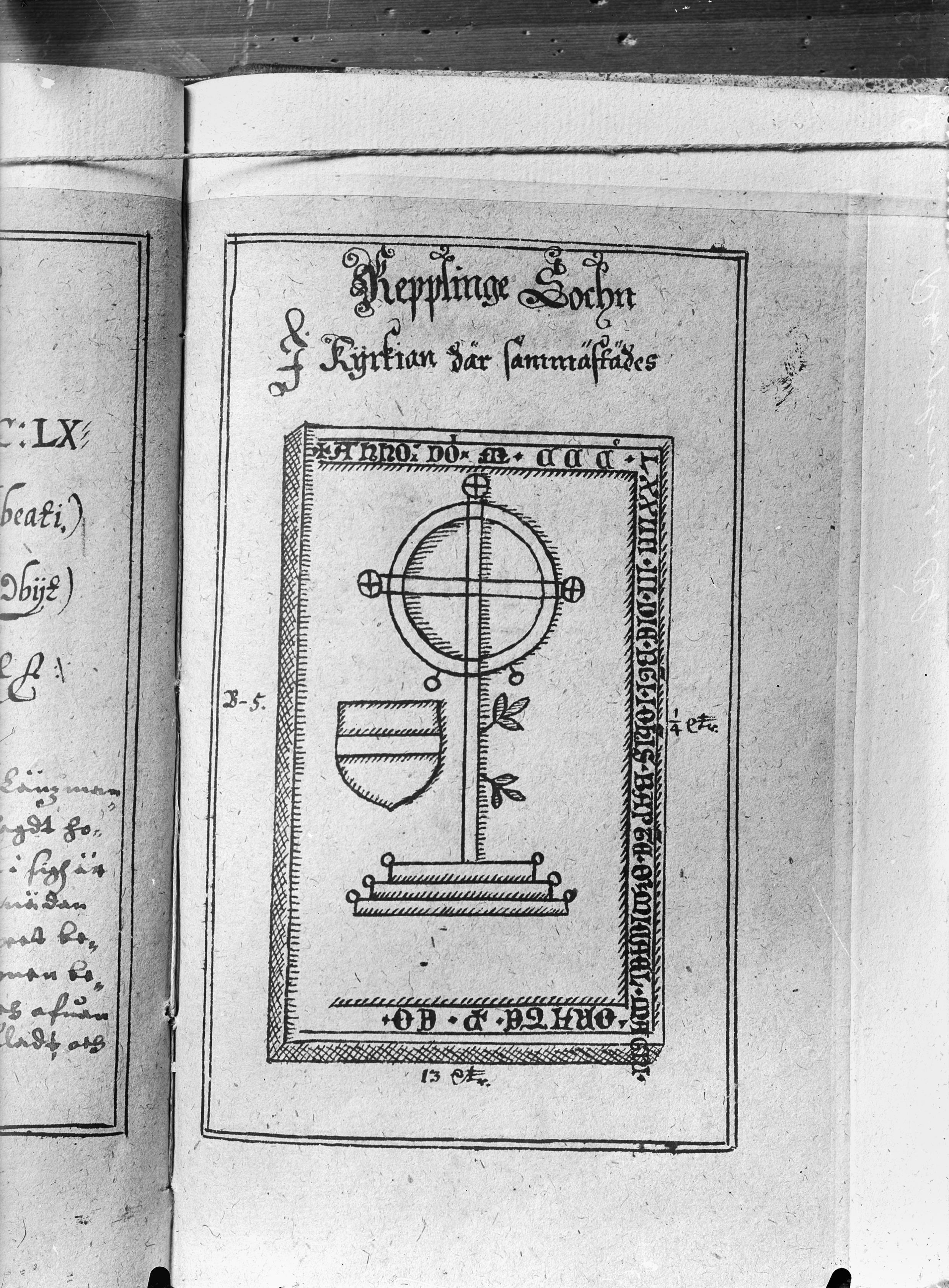 Beskrivning: Teckning av gravhäll. Ur Rhezelius Mon. run in Öl, 1634. KB.