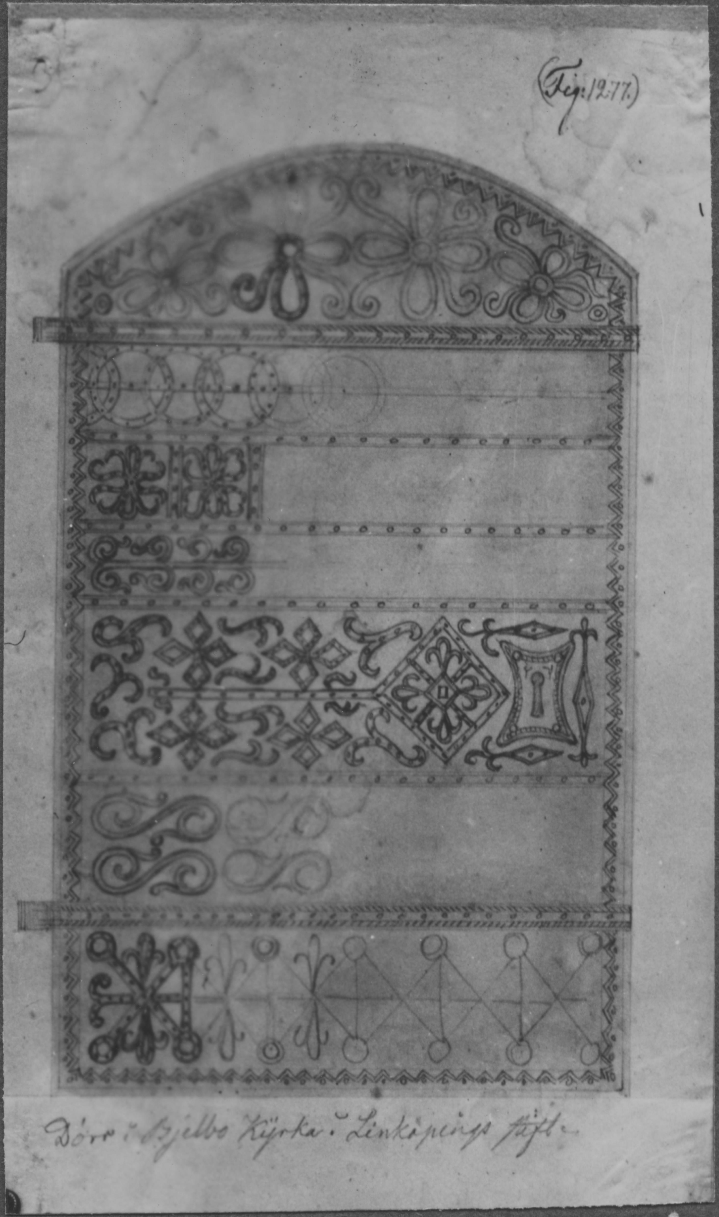 Beskrivning: Teckning föreställande dörr med järnbeslag.