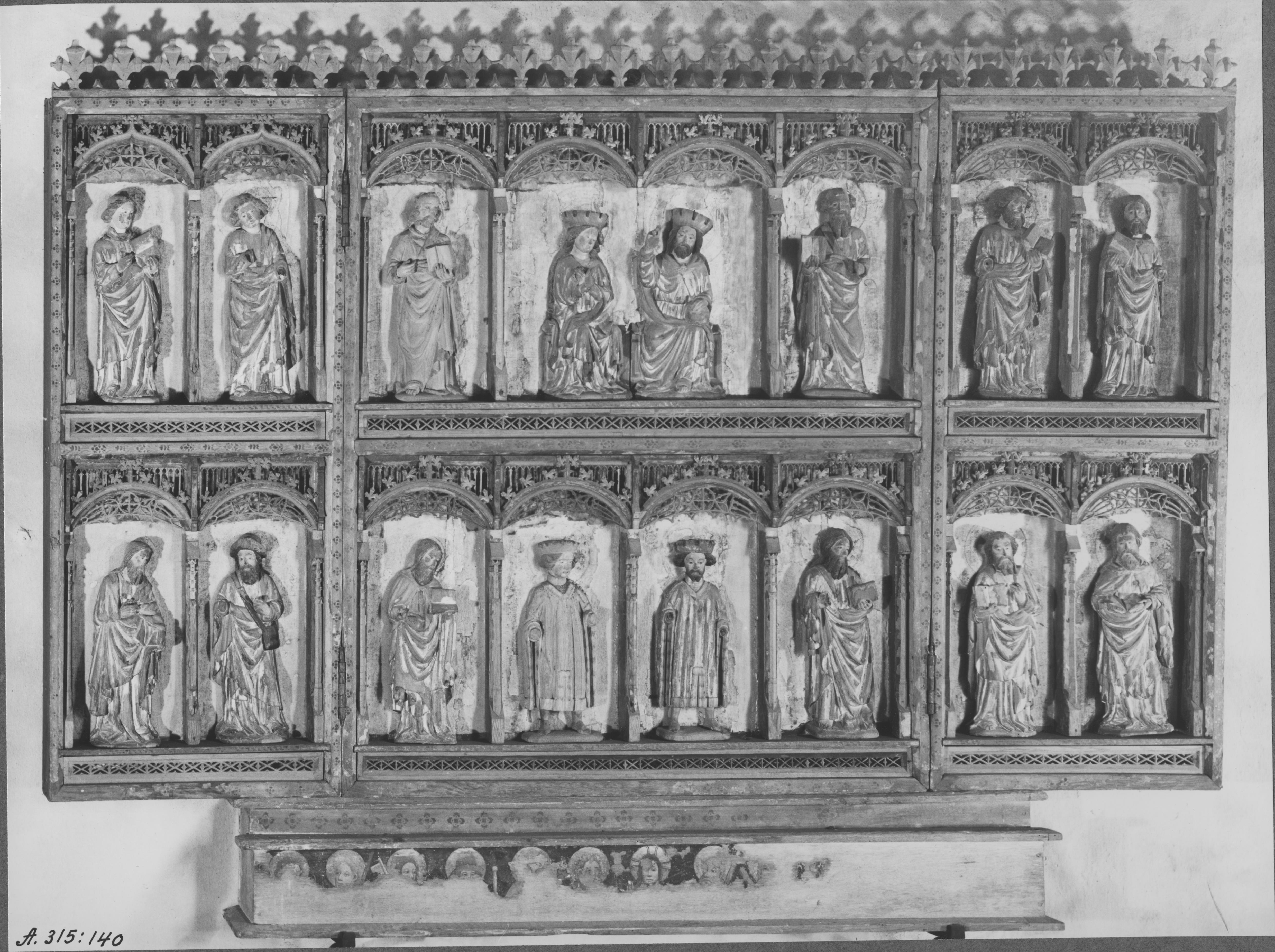 Beskrivning: Altarskåp med snidade och målade träfigurer.
