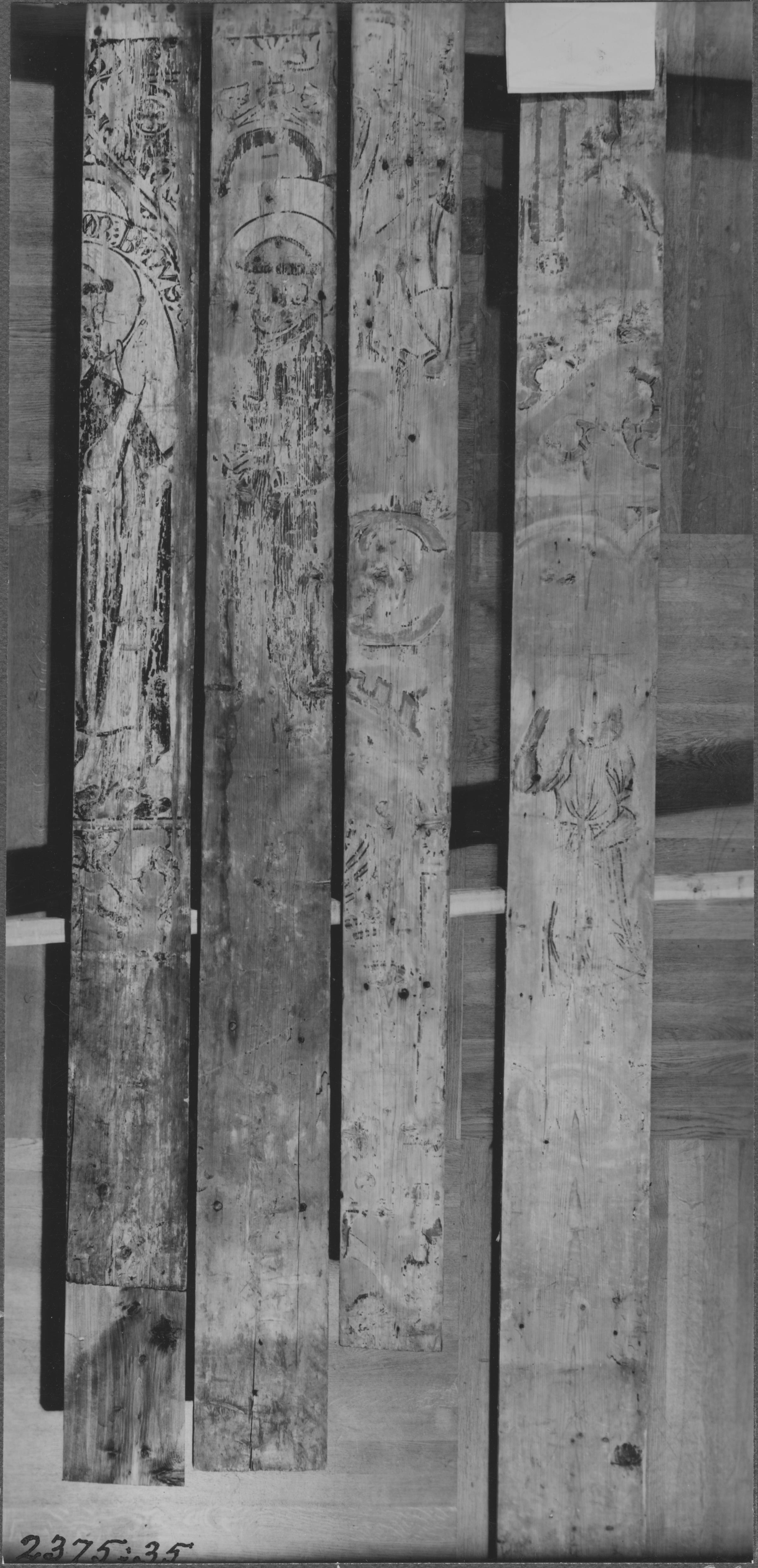 Beskrivning: Del av målad väggpanel. Den helige Dominikus och den helige Franciskus. Thomas Beckets historia. En krympling botas.