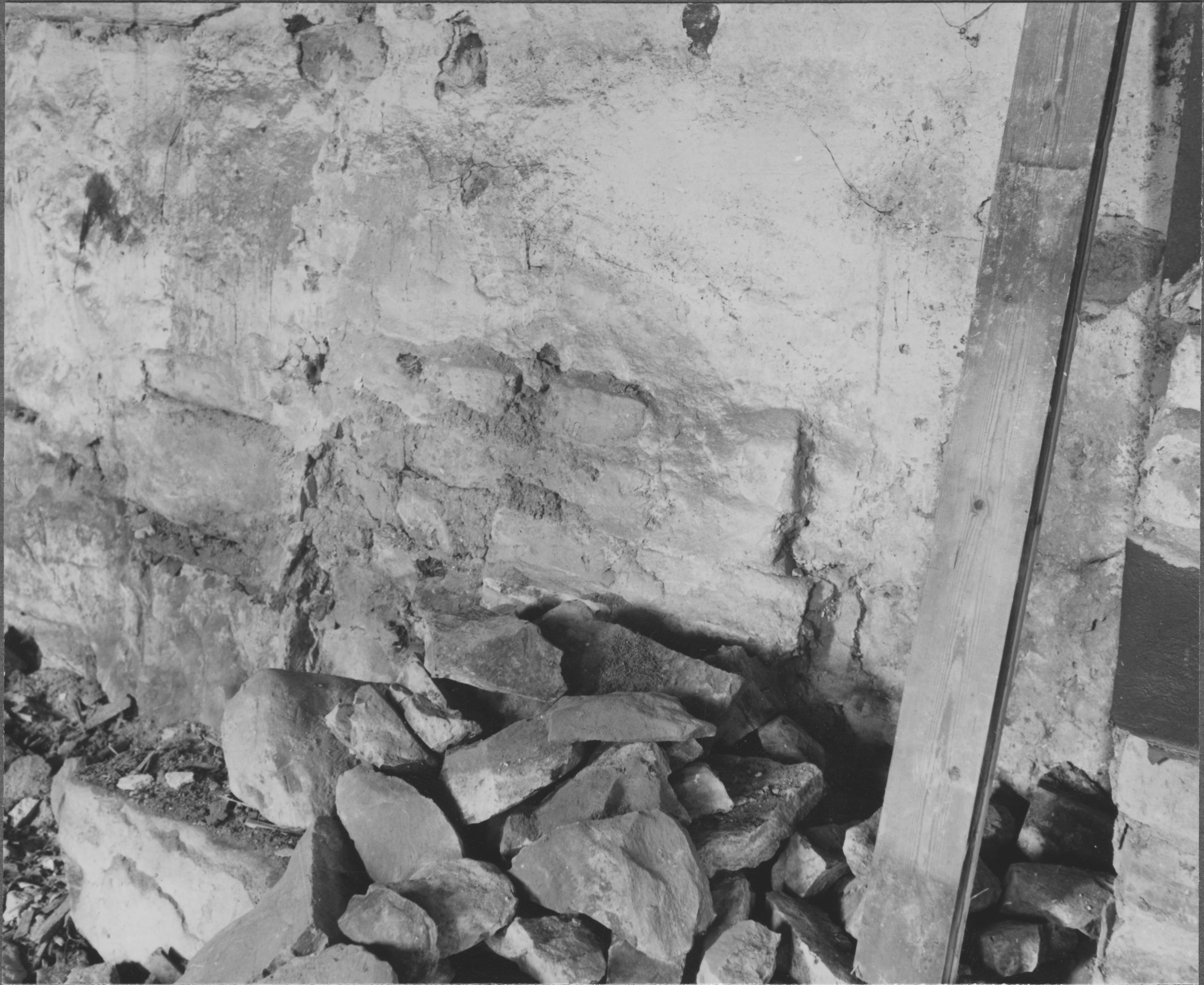 Beskrivning: Spår efter tvärskeppets västra murs anslutning till nuvarande långhustes norra mur.