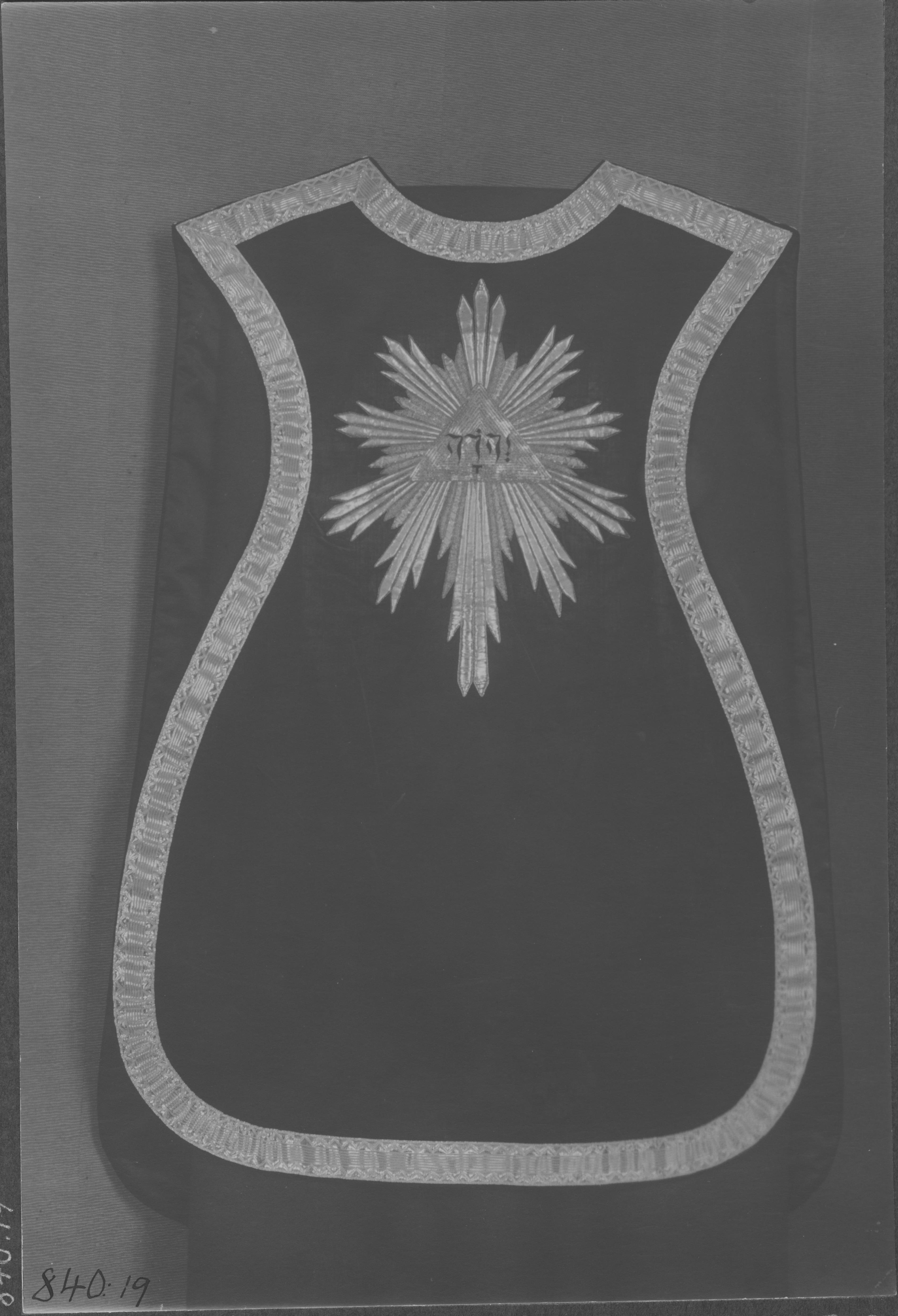 Beskrivning: Mässhake av svart sammet med gudsöga och galoner av silver.