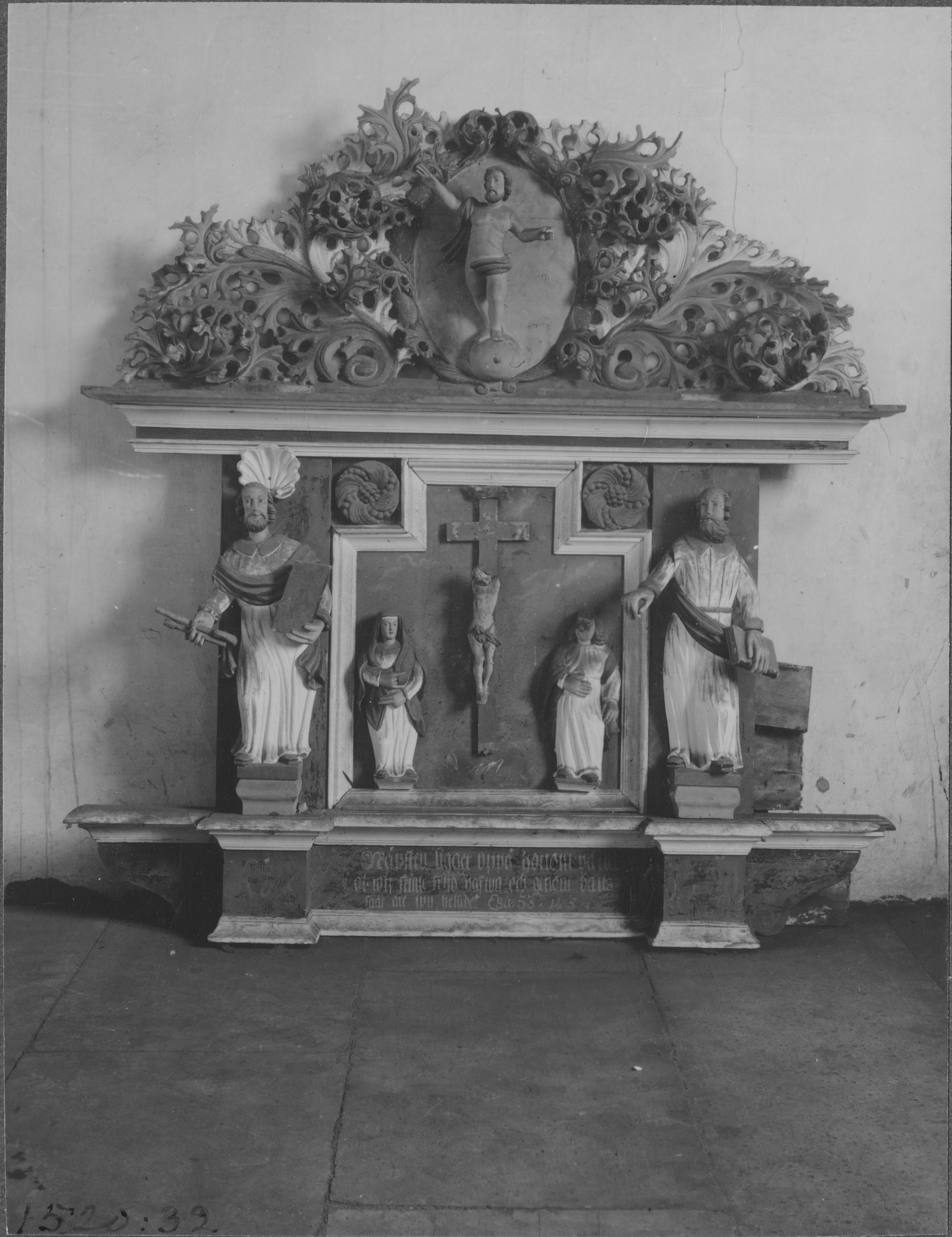 Beskrivning: Altarprydnad av trä, arkitektoniskt uppbyggd med lövverk på överstycke. Huvudframställning Kristus på korset. Daterad 1720. Från Västra Skrukeby kyrka. Återlämnad till kyrkan 1949.