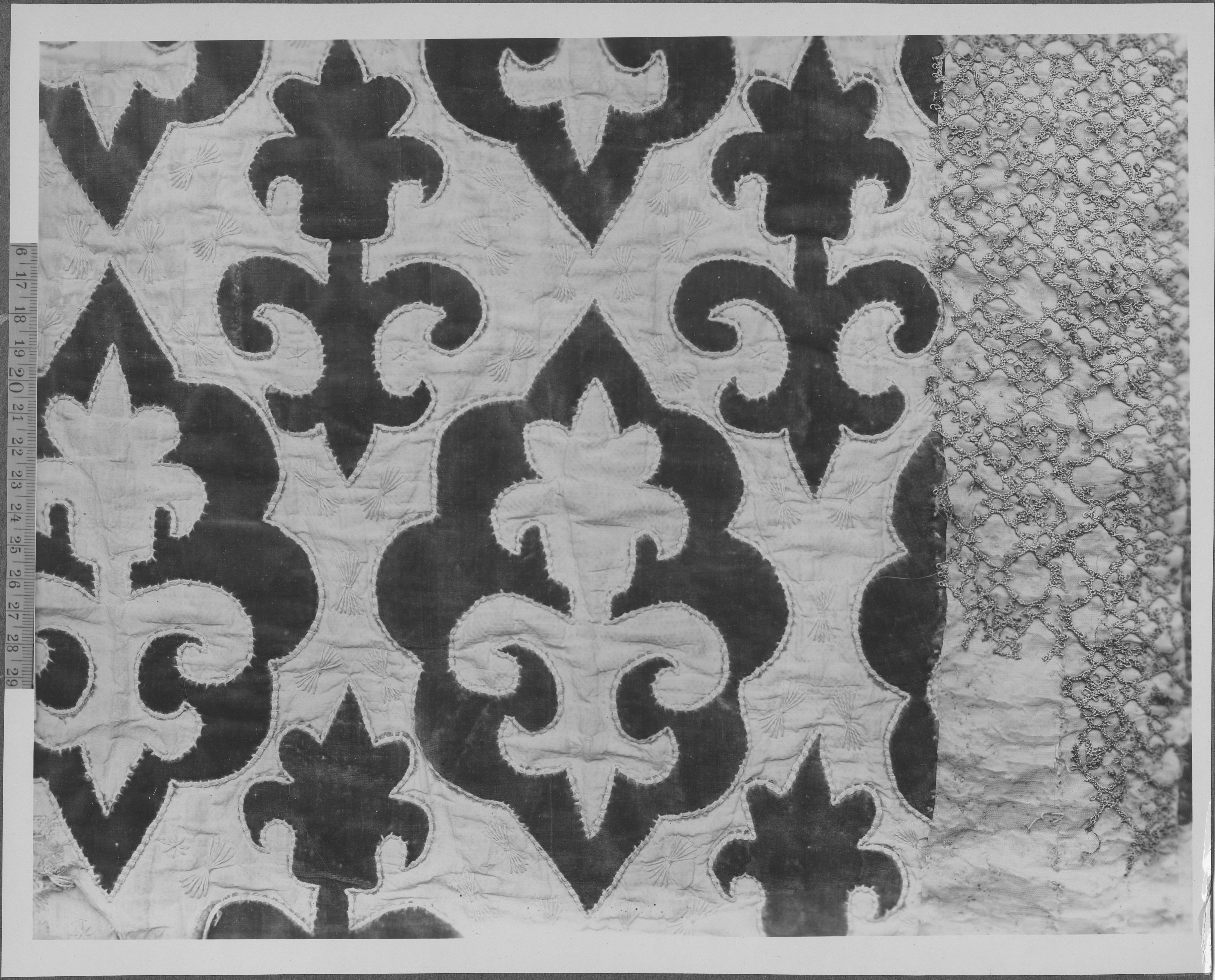 Beskrivning: Mässhake av gul och röd brokadsammet med kors av silverspets. 1642 i silverbroderi. Detalj. Textilutställning Stockholm 1929. Nummer 258.