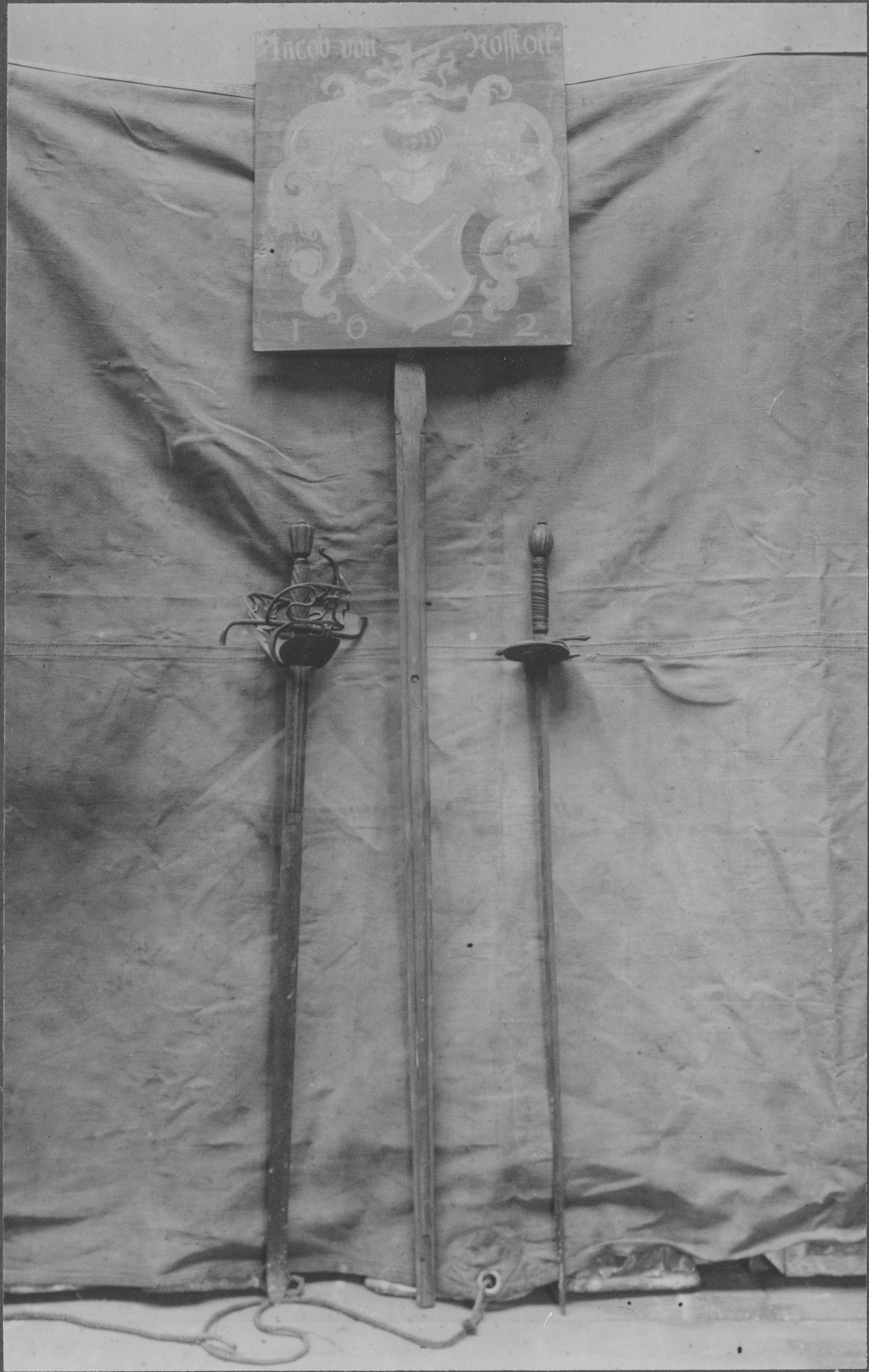 Beskrivning: Begravningsvapen. Kvadratisk brädskiva fastsatt med en stång. Målat vapen betsående av två korslagda svärd. Text: "Jacob von Rostock 1622". Före konservering.Huggvärja av stål samt officersvärja av stål.