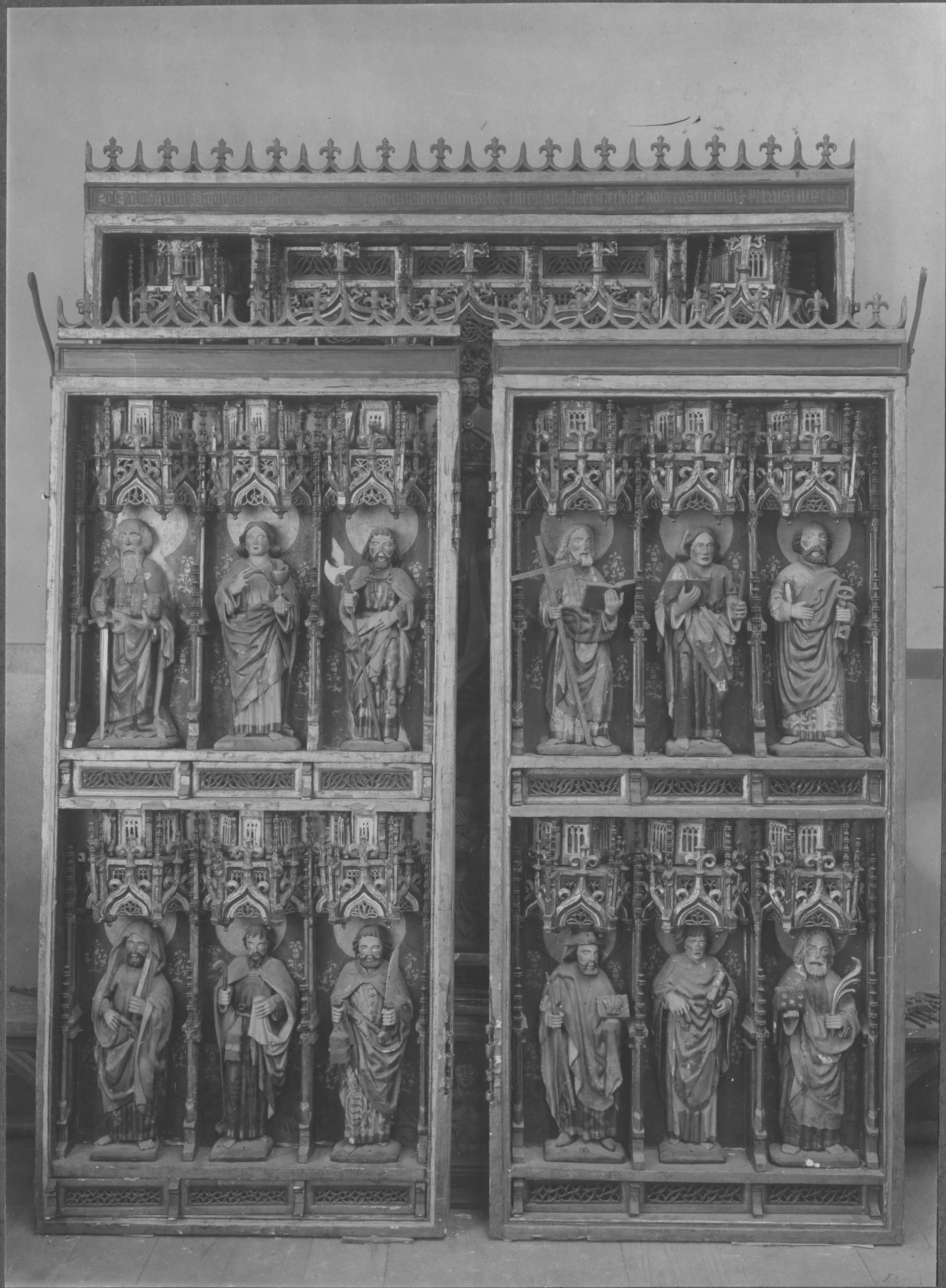 Beskrivning: Altarskåp, Mariaaltarskåpet, av trä med skulpterade figurer. Flyglarna med de tolv apostlarna. Från den gamla kyrkan. Omkring 1500. Nordöstra väggen. Före konservering 1930.